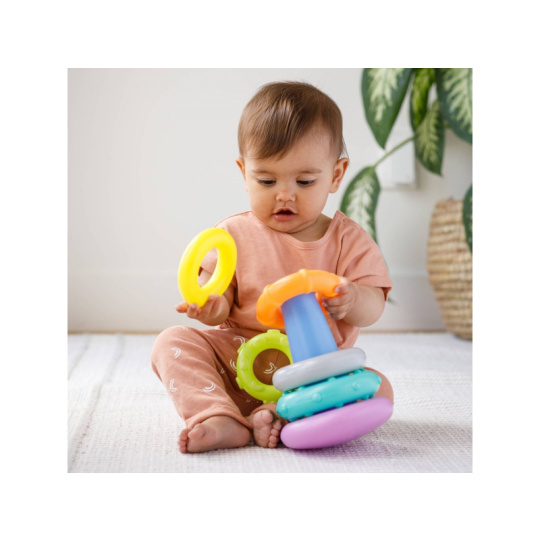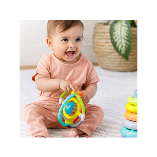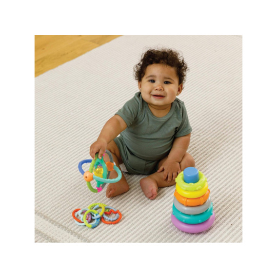 Sada hraček pro nejmenší je ideální jako první dárek pro miminko. Chrastítko Orbit s různými texturami ke zkoumání má tvar pro snadné uchopení rukou i ústy. Korálky uvnitř průhledného kroužku při pohybu jemně chrastí. Lehké a snadno uchopitelné chrastítko s kroužky je tvořené z osmi navzájem propojitelných kroužků, které můžete různými způsoby spojovat i používat samostatně. Každý kroužek nabízí jinou texturu ke zkoumání rukama i ústy. Pyramida je tvořena kulatou základnou a nasazovacími kroužky různých barev, velikostí i textur. Dítě se snaží umístit kroužky ve správném pořadí a vytvořit z nich pyramidu. Díky kulaté základně se hračka kýve do všech stran a nasazení kroužků bude pro dítě docela výzva! Hračky rozvíjí zábavným způsobem jemnou motoriku a koordinaci rukou a očí dítěte. Vhodné pro děti od narození.