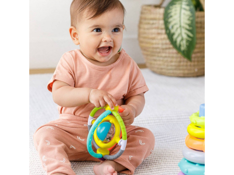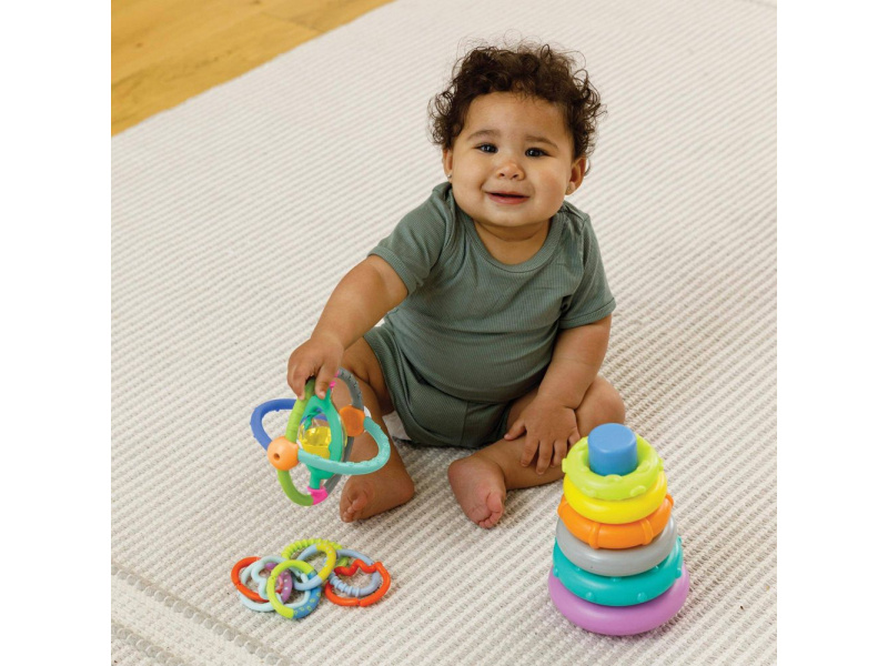 Sada hraček pro nejmenší je ideální jako první dárek pro miminko. Chrastítko Orbit s různými texturami ke zkoumání má tvar pro snadné uchopení rukou i ústy. Korálky uvnitř průhledného kroužku při pohybu jemně chrastí. Lehké a snadno uchopitelné chrastítko s kroužky je tvořené z osmi navzájem propojitelných kroužků, které můžete různými způsoby spojovat i používat samostatně. Každý kroužek nabízí jinou texturu ke zkoumání rukama i ústy. Pyramida je tvořena kulatou základnou a nasazovacími kroužky různých barev, velikostí i textur. Dítě se snaží umístit kroužky ve správném pořadí a vytvořit z nich pyramidu. Díky kulaté základně se hračka kýve do všech stran a nasazení kroužků bude pro dítě docela výzva! Hračky rozvíjí zábavným způsobem jemnou motoriku a koordinaci rukou a očí dítěte. Vhodné pro děti od narození.