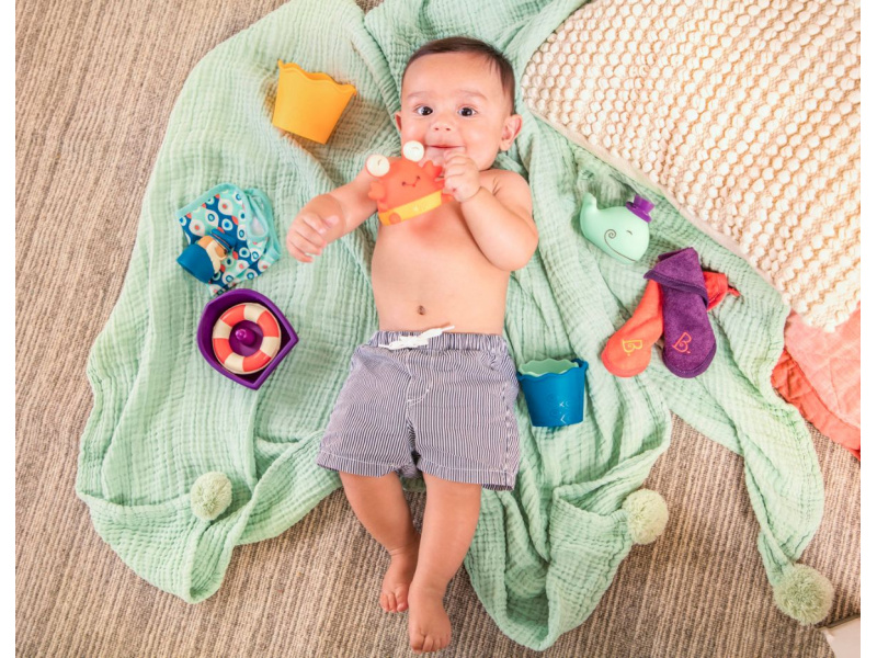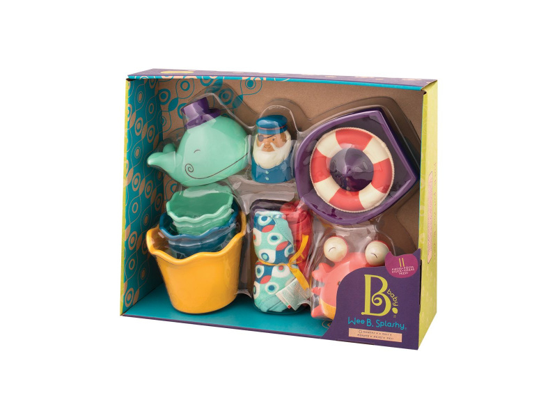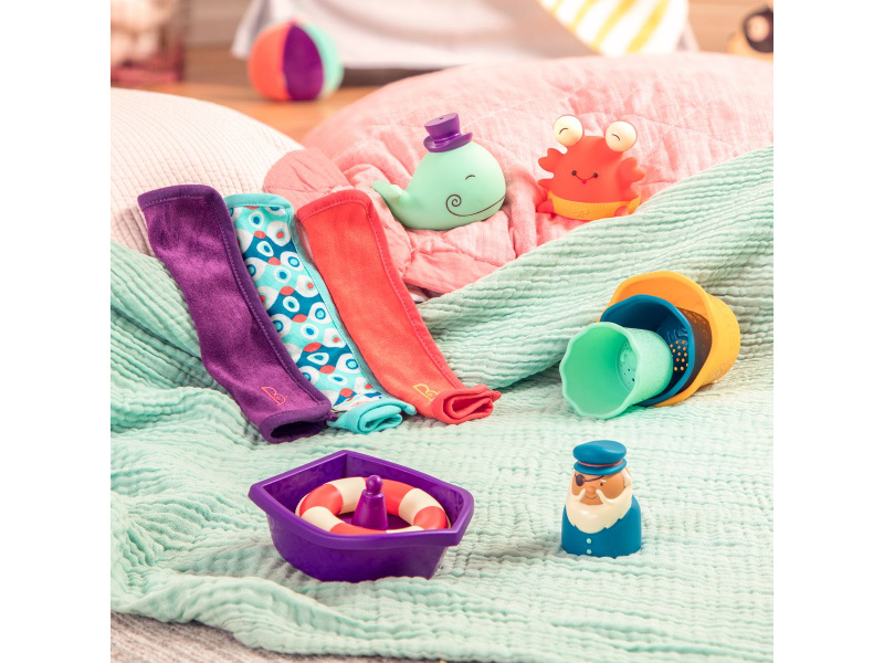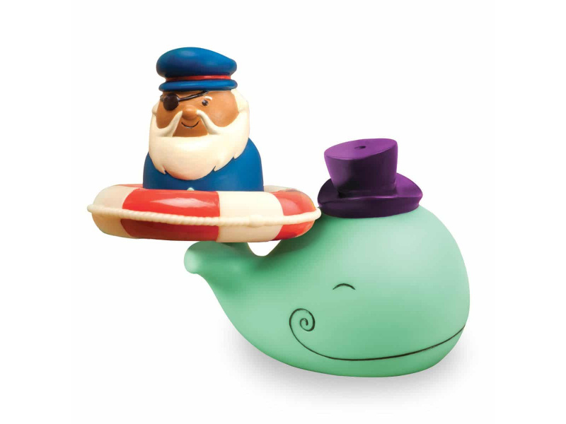 Velká sada hraček do koupele promění každé koupání ve chvíle plné zábavy pro děti i rodiče. Všemu velí kapitán ve člunu se záchranářským kruhem! 11-dílná sada obsahuje dvě stříkací hračky v podobě velryby a jejího kamaráda z moře, člun, kruh, postavu kapitána, tři kelímky s otvory a 3 textilní žínky. Hraní s hračkami ve vodě pomáhá rozvíjet dětskou představivost i jemnou motoriku. Vhodné pro děti od narození.