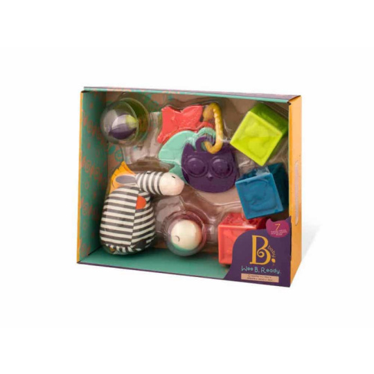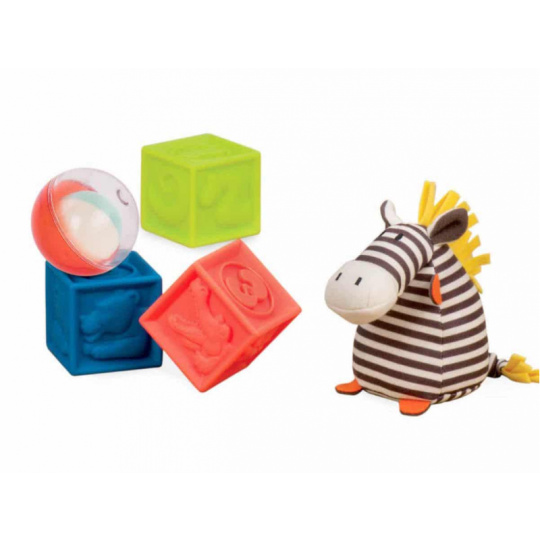 Dárková sada hraček pro děti od narození obsahuje 7 krásných, barevných hraček pro zábavu i rozvíjení dětských smyslů. Součástí sady je plyšová cinkající zebra, kroužek se třemi barevnými kousátky, dva průhledné míčky a tři kostky z měkkého plastového materiálu, které po zmáčknutí pískají a svými různorodými texturami lákají ke zkoumání rukama i ústy. Všechny hračky mají tvar a velikost pro snadné uchopení malými dětskými ručičkami. Vhodné pro děti od narození.