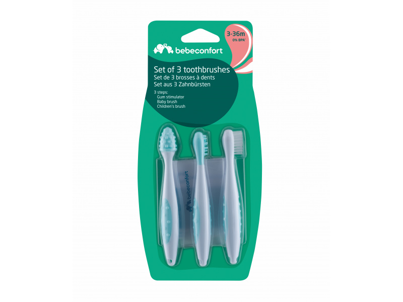 Sada obsahuje masážní kartáček pro dásně dítěte před prořezáním prvních zoubků, masážní kartáček pro první zoubky a citlivé dásně a kartáček pro batolata na klasické čištění zoubků. Rukojeť kartáčků umožňuje snadné držení. Součástí balení je praktické úložné pouzdro. Vhodné pro děti od 3 do 36 měsíců.