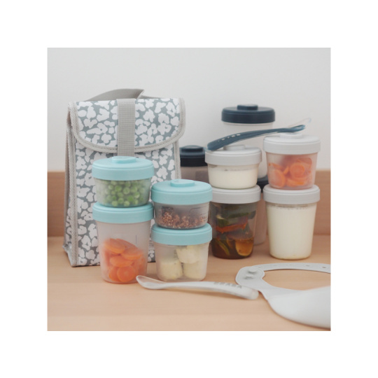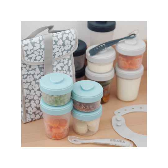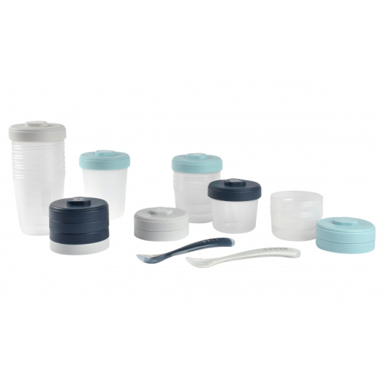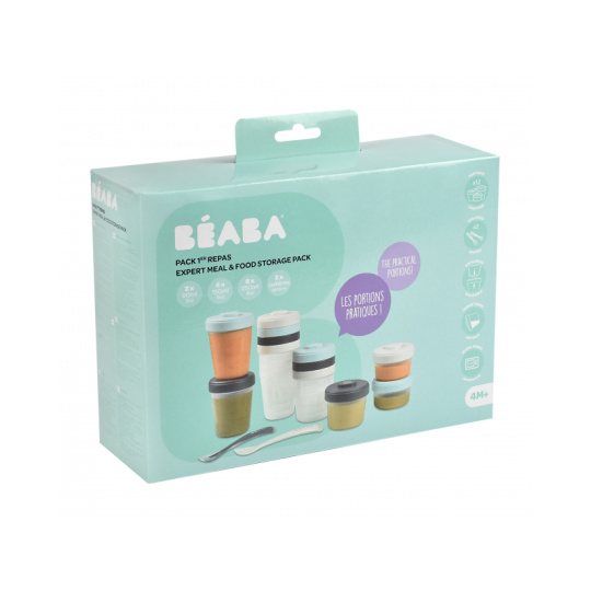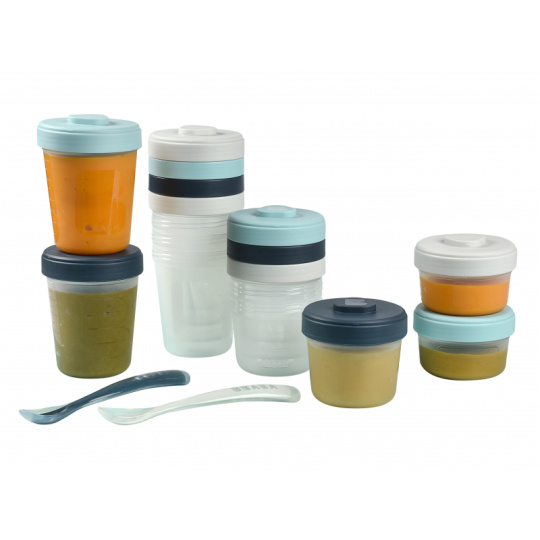 Sada kelímků Beaba na dětskou stravu z vysoce kvalitního polypropylenu s hermeticky uzavíratelným víčkem. Jídlo v kelímcích lze zamrazit či uložit do lednice a následně ohřívat v mikrovlnné troubě, ohřívačce nebo v Babycooku. Speciálně navržené víčko a dno kelímku umožňuje kelímky na sebe zacvaknout, což usnadňuje jejich uložení do lednice či mrazáku. Kelímky se dají popsat pro rychlou orientaci v lednici či mrazáku. Ryska v mililitrech slouží ke pro snadnému určení objemu příkrmu. Silikonové lžičky pro první samostatné krmení mají ideální tvar pro dětská ústa. Tvar držadla usnadňuje dítěti držení lžičky. Lžička má na spodní straně rukojeti opěrku pro možnost hygienického odložení lžičky na stůl. Možno mýt v myčce. Zdravotně nezávadný materiál neobsahuje BPA, BPF, BPS, PVC ani ftaláty a je tak vhodný pro bezpečné uchovávání dětské stravy. Balení obsahuje 2x kelímek o objemu 90 ml, 4x kelímek o objemu 150 ml, 6x kelímek o objemu 250 ml a 2 silikonové lžičky.