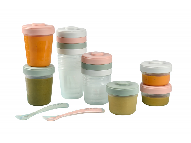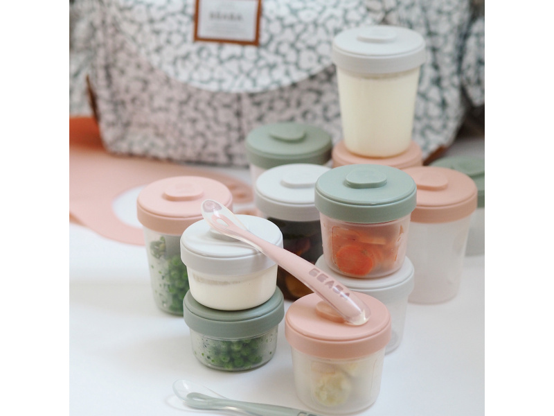 Sada kelímků Beaba na dětskou stravu z vysoce kvalitního polypropylenu s hermeticky uzavíratelným víčkem. Jídlo v kelímcích lze zamrazit či uložit do lednice a následně ohřívat v mikrovlnné troubě, ohřívačce nebo v Babycooku. Speciálně navržené víčko a dno kelímku umožňuje kelímky na sebe zacvaknout, což usnadňuje jejich uložení do lednice či mrazáku. Kelímky se dají popsat pro rychlou orientaci v lednici či mrazáku. Ryska v mililitrech slouží ke pro snadnému určení objemu příkrmu. Silikonové lžičky pro první samostatné krmení mají ideální tvar pro dětská ústa. Tvar držadla usnadňuje dítěti držení lžičky. Lžička má na spodní straně rukojeti opěrku pro možnost hygienického odložení lžičky na stůl. Možno mýt v myčce. Zdravotně nezávadný materiál neobsahuje BPA, BPF, BPS, PVC ani ftaláty a je tak vhodný pro bezpečné uchovávání dětské stravy. Balení obsahuje 2x kelímek o objemu 90 ml, 4x kelímek o objemu 150 ml, 6x kelímek o objemu 250 ml a 2 silikonové lžičky.