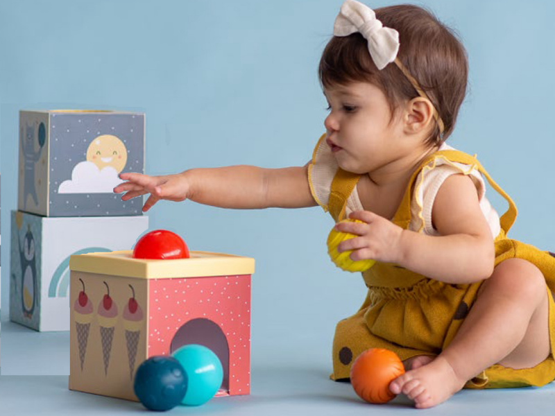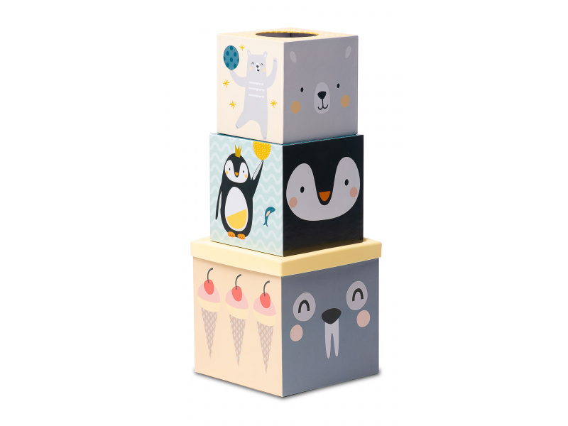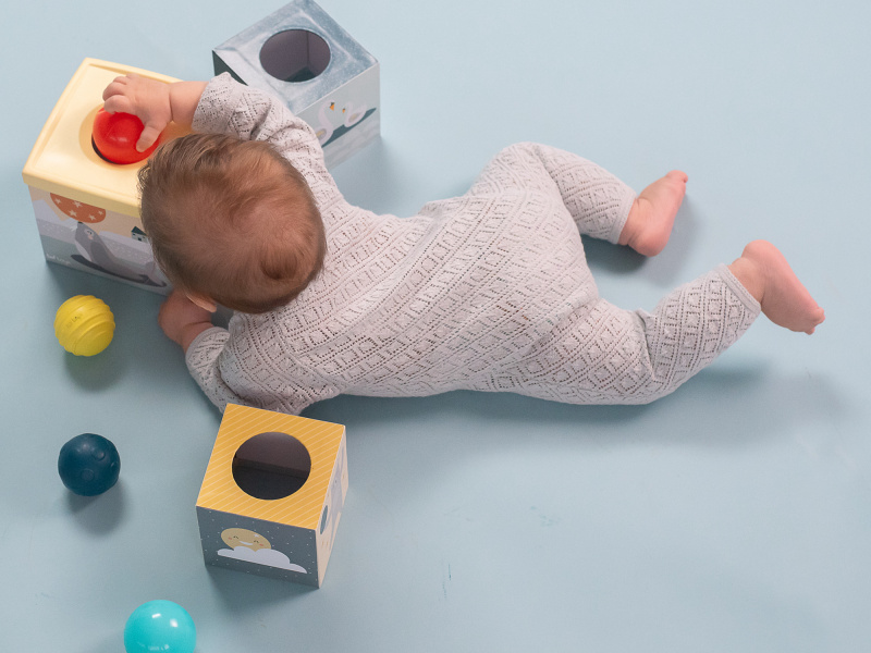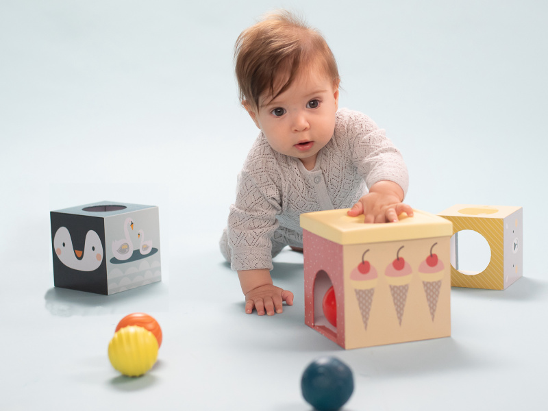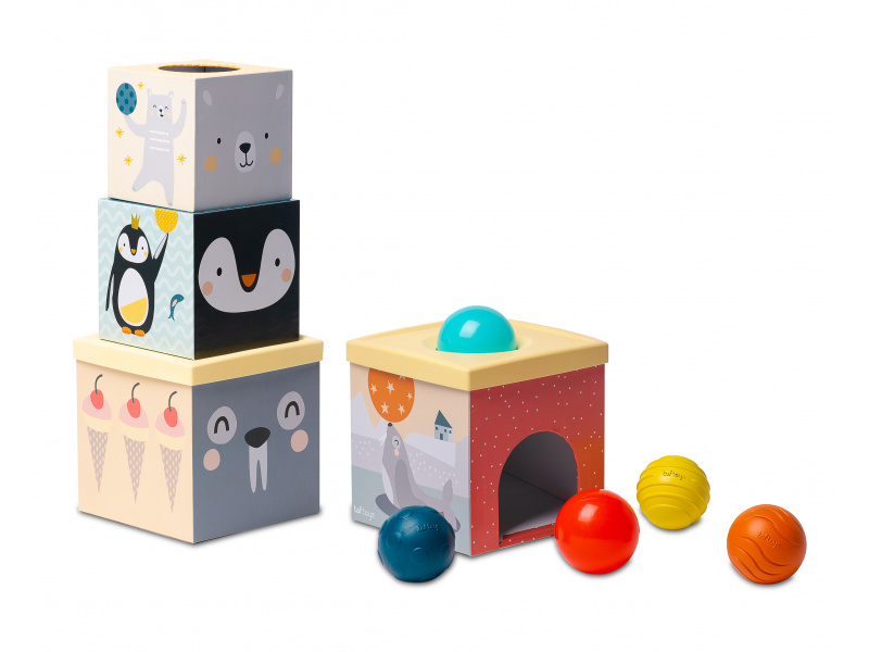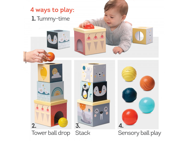 Variabilní sada kostek a míčků zabaví vaše dítě při hře na bříšku, vsedě i vestoje a bude vás lákat i ke společné hře s dítětěm. při hře na bříšku může dítě vkládat míček do otvoru v některé z kostek tři míčky s různou texturou při zmáčknutí jemně pískají a snadnou projdou otvorem v kostce dva hladké míčky vyžadují, aby byly do otvoru zamáčknuty rukou kostky mohou být skládány na sebe podle barev či podle ilustrací s motivy zvířátek při postavení věže ze tří kostek po vhození jednoho ze tří senzorických míčků do otvoru nahoře míček propadne všemi kostkami a vykutálí se otvorem ve spodní kostce Hračka rozvíjí jemnou i hrubou motoriku, koordinaci ruka-oko a jednotlivé smysly dítěte. Zároveň podporuje rozvoj dovedností pro řešení problémů. Hra, při které míček nejprve zmizí uvnitř a pak se znovu objeví, pomáhá dítěti uvědomit si, že předměty existují, i když zrovna nejsou vidět. Rodič hračku může využít pro učení dítěte barvám, tvarům i rozpoznání různých velikostí. Sada obsahuje tři vkládací / stohovací kostky, 3 senzorické míčky a 2 hladké míčky. Rozměr velké kostky: 13.5 x 13,5 x 13,5 cm Vhodné pro děti od 6 měsíců.