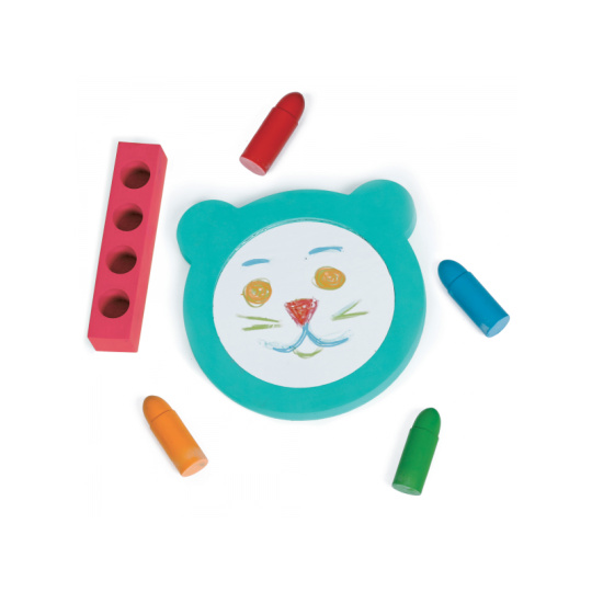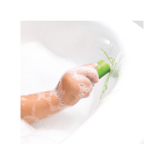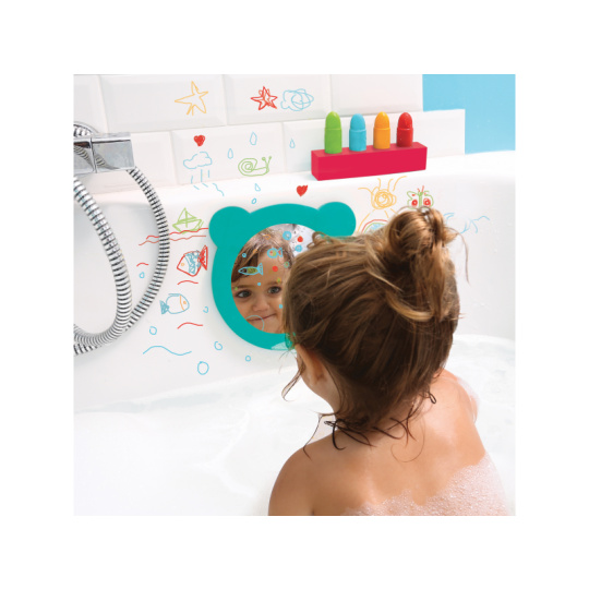 Kreativní sada na malování ve vaně obsahuje velké zrcátko a 4 voděodolné, ale smazatelné voskovky. Bezpečné zrcátko s pěnovou zadní stranou se snadno přilepí hladkou navlhčenou stěnu vany nebo na dlaždice nad vanou. Voskovky ve čtyřech výrazných barvách snadno promění vaši vanu v umělecké dílo! Nemusíte mít žádné obavy z poškození, po skončení koupele vanu snadno umyjete houbou. Voskovky mají tvar pro snadné držení a jsou voděodolné, takže se nebudou rozpouštět, když je dítě upustí během koupání do vody. Součástí balení je i držák pro bezpečné uložení voskovek do dalšího koupání. Nerozbitné zrcátko můžete nechat plavat na hladině i jej po osušení používat pro zabavení dítěte i mimo koupání. Sada na malování pomáhá rozvíjet fantazii, kreativitu i jemnou motoriku dítěte. Rozměry: průměr zrcadla Ø 20 cm, voskovky 7 x 2,5 cm. Vhodné pro děti od 10 měsíců.