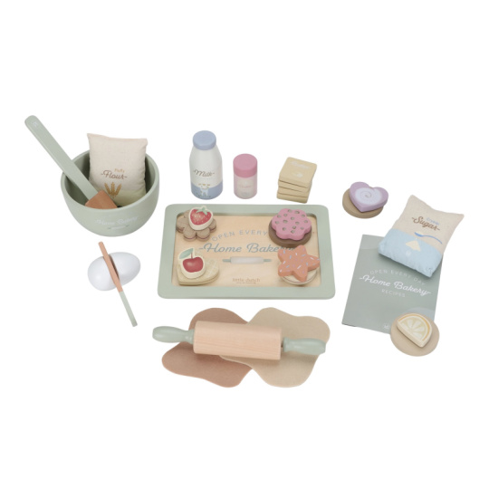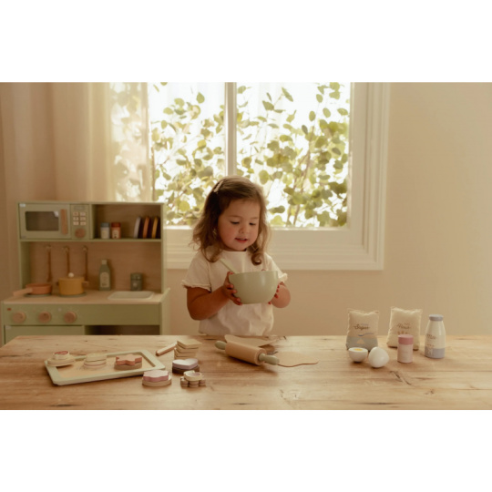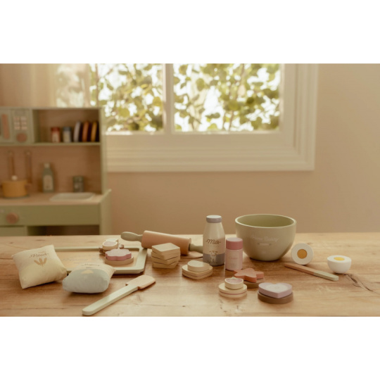Je čas upéct něco dobrého! S touto krásnou dřevěnou sadou na pečení Little Dutch si malí pekaři osvojí základy pečení a připraví ty nejlahodnější sušenky nebo dortíky – samozřejmě bez nepořádku. Sada obsahuje vše potřebné pro pečení: kartičku s receptem, dřevěné suroviny jako vejce, máslo, mouku, cukr, mléko, barevné posypky a k tomu misu na míchání, váleček, tác a doplňky na zdobení. Nechybí ani hotové kousky cukroví a plát těsta z plsti, který si mohou děti rozválet a nazdobit podle vlastní fantazie. Sada přináší hodiny nápadité a tvůrčí zábavy, podporuje představivost, kreativitu a jemnou motoriku. Ideální jako samostatná hračka nebo jako doplněk k samostatně prodávané dětské kuchyňce. Hračka je součástí kolekce vysoce kvalitních dřevěných hraček Little Dutch, navržených s důrazem na bezpečnost a originální design. Vyrobeno z odolného FSC certifikovaného dřeva. Rozměry: 23,1 × 16,8 × 9 cm Vhodné pro děti od 3 let.