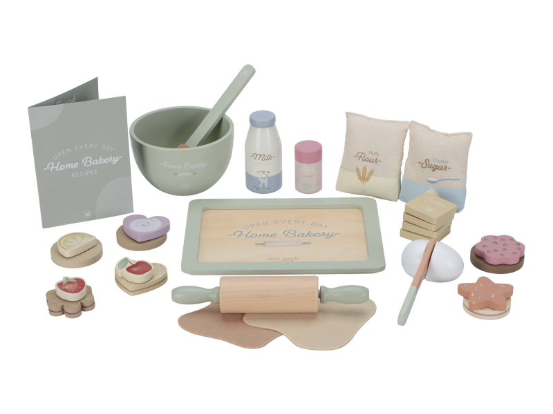 Je čas upéct něco dobrého! S touto krásnou dřevěnou sadou na pečení Little Dutch si malí pekaři osvojí základy pečení a připraví ty nejlahodnější sušenky nebo dortíky – samozřejmě bez nepořádku. Sada obsahuje vše potřebné pro pečení: kartičku s receptem, dřevěné suroviny jako vejce, máslo, mouku, cukr, mléko, barevné posypky a k tomu misu na míchání, váleček, tác a doplňky na zdobení. Nechybí ani hotové kousky cukroví a plát těsta z plsti, který si mohou děti rozválet a nazdobit podle vlastní fantazie. Sada přináší hodiny nápadité a tvůrčí zábavy, podporuje představivost, kreativitu a jemnou motoriku. Ideální jako samostatná hračka nebo jako doplněk k samostatně prodávané dětské kuchyňce. Hračka je součástí kolekce vysoce kvalitních dřevěných hraček Little Dutch, navržených s důrazem na bezpečnost a originální design. Vyrobeno z odolného FSC certifikovaného dřeva. Rozměry: 23,1 × 16,8 × 9 cm Vhodné pro děti od 3 let.