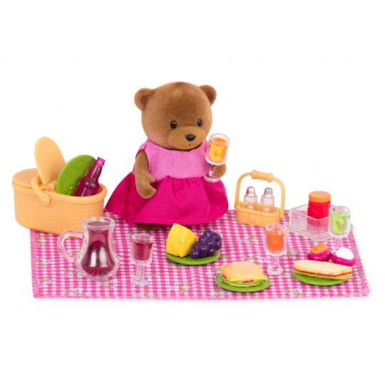 Když je v městečku Honeysuckle Hollow krásné počasí, je to ten pravý čas na uspořádání pikniku v parku. V sadě na piknik najdete všechno, co kamarádi z městečka mají rádi. Součástí balení je postavička medvědí holčičky Hazel. 29-dílná sada obsahuje: postavičku medvídka s oblečením, deku, piknikový košík, kousek sýra, 4 šálky, džbán na šťávu, solničku, pepřenku, stojánek na sůl a pepř, sklenici džemu, 2 košíčky, hrozen vína, láhev s pitím, čokoládovou tyčinku, chleba s marmeládou, porci salátu, nádobu na salát s víčkem, plněnou bagetu, hamburger a 4 talíře. Postavičky zvířátek Li'l Woodzeez jsou vyrobené z měkkého příjemného materiálu a mají pohyblivé ruce, nohy i hlavy pro zábavnou předstíranou hru. Každá postavička má na sobě krásné barevné oblečení. Další postavičky zvířátek, domečky, obchody, dopravní prostředky apod. se prodávají samostatně. Všechny postavičky a doplňky Li'l Woodzeez jsou navzájem kompatabilní a umožní vám vytvořit originální městečko pro nekonečnou hru rozvíjející fantazii a kreativitu vašeho dítěte. Vhodné pro děti od 3 let.