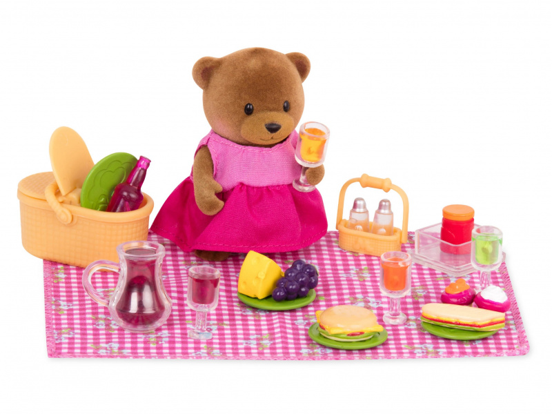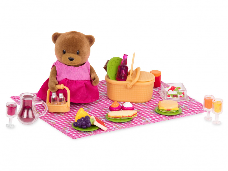 Když je v městečku Honeysuckle Hollow krásné počasí, je to ten pravý čas na uspořádání pikniku v parku. V sadě na piknik najdete všechno, co kamarádi z městečka mají rádi. Součástí balení je postavička medvědí holčičky Hazel. 29-dílná sada obsahuje: postavičku medvídka s oblečením, deku, piknikový košík, kousek sýra, 4 šálky, džbán na šťávu, solničku, pepřenku, stojánek na sůl a pepř, sklenici džemu, 2 košíčky, hrozen vína, láhev s pitím, čokoládovou tyčinku, chleba s marmeládou, porci salátu, nádobu na salát s víčkem, plněnou bagetu, hamburger a 4 talíře. Postavičky zvířátek Li'l Woodzeez jsou vyrobené z měkkého příjemného materiálu a mají pohyblivé ruce, nohy i hlavy pro zábavnou předstíranou hru. Každá postavička má na sobě krásné barevné oblečení. Další postavičky zvířátek, domečky, obchody, dopravní prostředky apod. se prodávají samostatně. Všechny postavičky a doplňky Li'l Woodzeez jsou navzájem kompatabilní a umožní vám vytvořit originální městečko pro nekonečnou hru rozvíjející fantazii a kreativitu vašeho dítěte. Vhodné pro děti od 3 let.