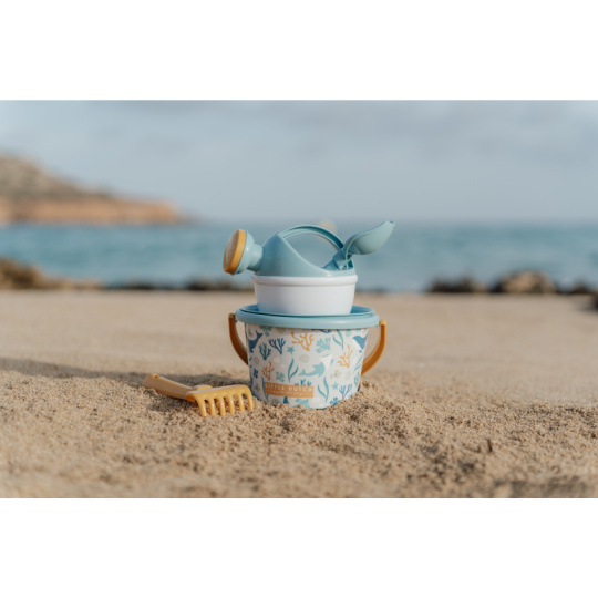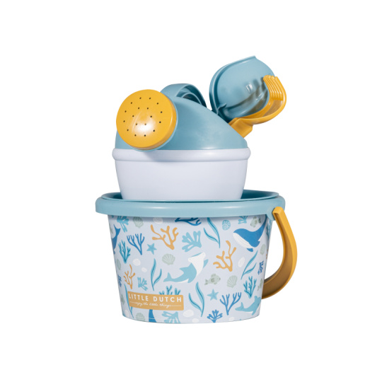 Sada na písek s krásným potiskem motivů ze života pod mořskou hladinou se bude dětem hodit doma na zahradě i u moře na pláži. Sadu tvoří kyblík, konvička, hrabičky, lopatka a sítko v kvalitním provedení z pevného plastu. Sada je součástí designové kolekce Little Dutch Ocean Dreams. Vhodné pro děti od 18 měsíců.
