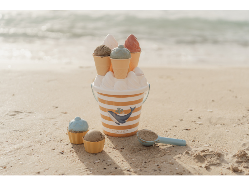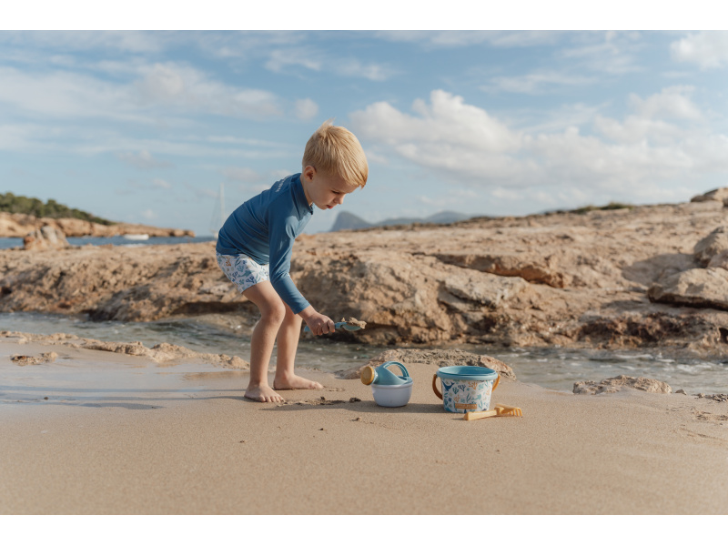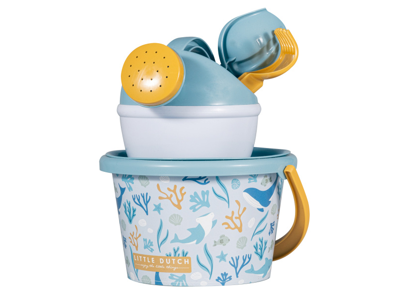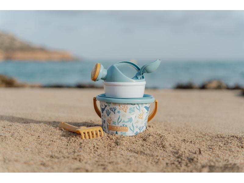 Sada na písek s krásným potiskem motivů ze života pod mořskou hladinou se bude dětem hodit doma na zahradě i u moře na pláži. Sadu tvoří kyblík, konvička, hrabičky, lopatka a sítko v kvalitním provedení z pevného plastu. Sada je součástí designové kolekce Little Dutch Ocean Dreams. Vhodné pro děti od 18 měsíců.
