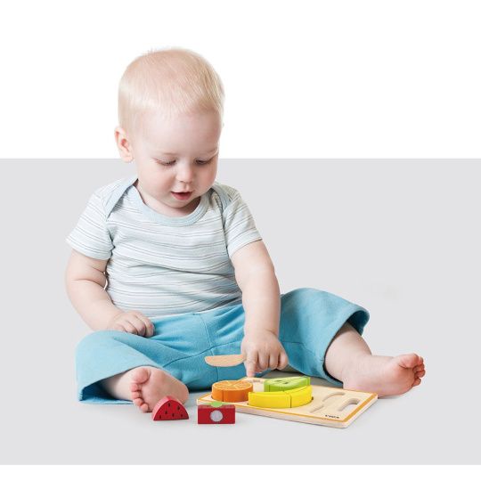 Sada na kríjení od společnosti Viga je ideální hračkou, která podněcuje dětskou představivost. Při společné hře bude moci každý rodič své dítě naučit, jak v budoucnu používat ostré kuchyňské doplňky. Jako bonus jsou všechny výrobky spojeny suchým zipem, což umožňuje je opět složit dohromady. Celá sada je vyrobena z lakovaného dřeva a natřena nezávadnými barvami .