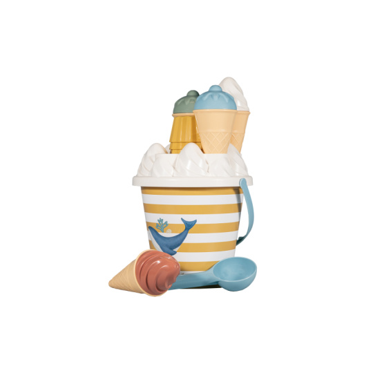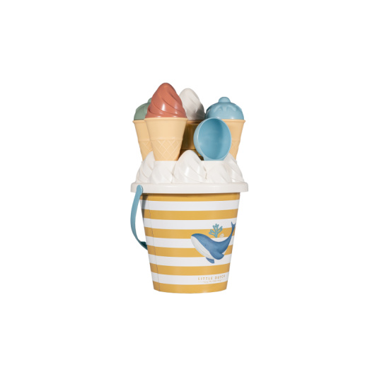 Zmrzlina patří k létu a s touto roztomilou sadou si ji vaše děti vyrobí i z písku. Sadu tvoří kyblík s rukojetí, čtyři kornouty, naběračka na zmrzlinu, sedm formiček a sítko. Sada je součástí designové kolekce Little Dutch Ocean Dreams. Kyblík má průměr 17 cm. Vhodné pro děti od 18 měsíců.