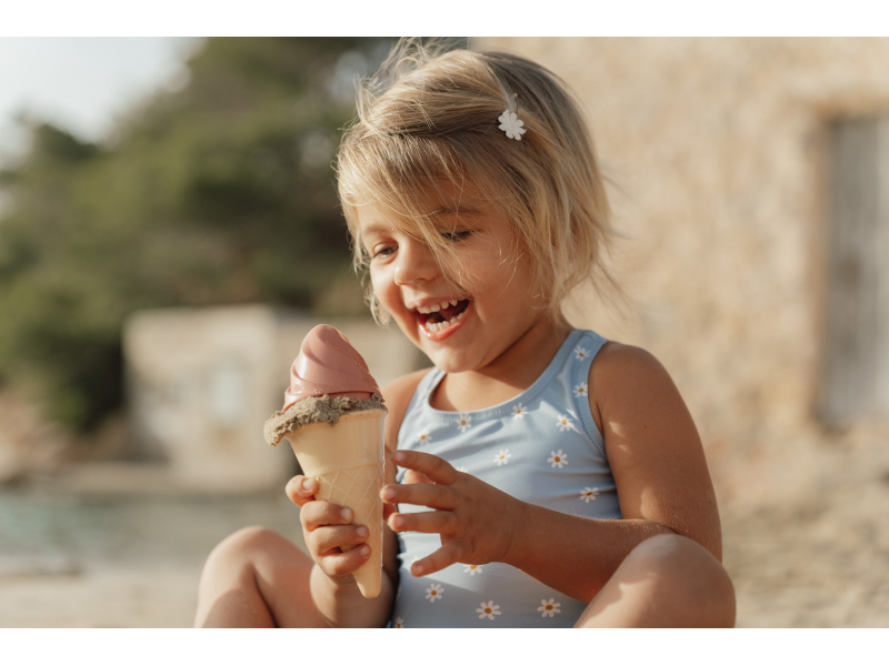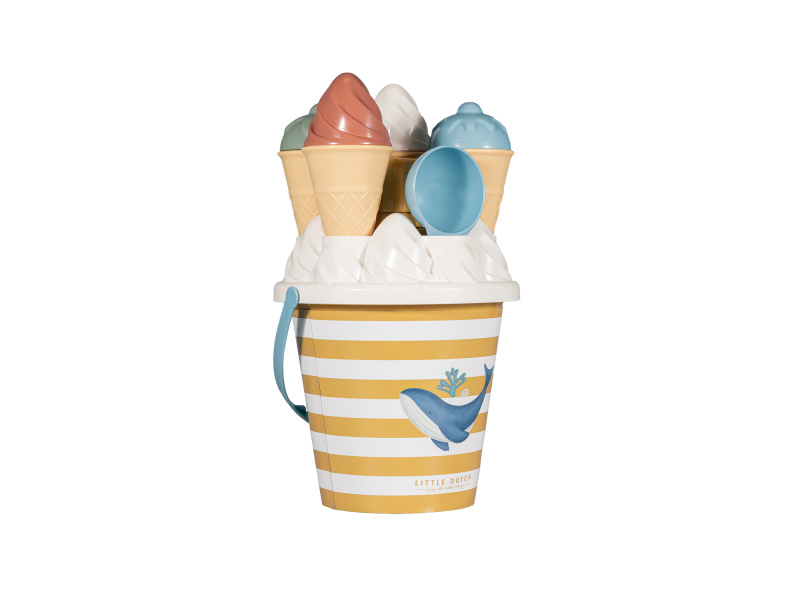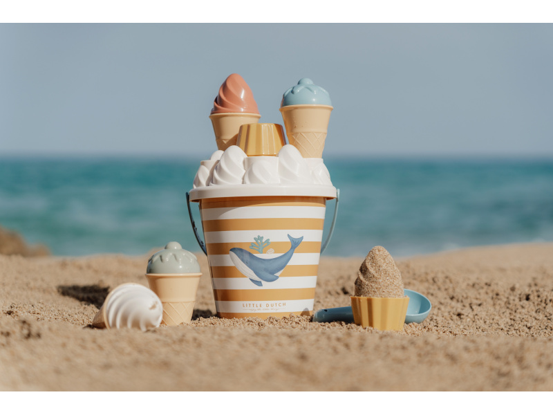 Zmrzlina patří k létu a s touto roztomilou sadou si ji vaše děti vyrobí i z písku. Sadu tvoří kyblík s rukojetí, čtyři kornouty, naběračka na zmrzlinu, sedm formiček a sítko. Sada je součástí designové kolekce Little Dutch Ocean Dreams. Kyblík má průměr 17 cm. Vhodné pro děti od 18 měsíců.