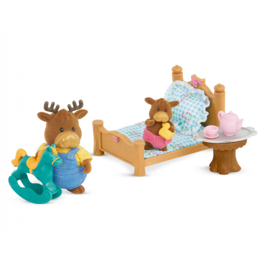 Sada nábytku vám umožní vybavit a zútulnit obývací a dětský pokoj v domečku pro postavičky zvířátek Li'l Woodzeez. Uložte miminko po nakrmení z lahvičky do kočárku, aby si rodiče mohli vychutnat kávu na pohodlné pohovce! Domeček i postavičky zvířátek se prodávají samostatně. Obsah 23-dílné sady: pohovka, židlička, kočárek, hračku, 3 kostky, chrastítko, tác, konvička, 2 šálky s podšálky, malý stolek, medvídek, lahvička na mléko, noční stolek, dětská postýlka, matrace, 1 polštář, houpací kůň, kačenka. Samostatně prodávané postavičky zvířátek Li'l Woodzeez jsou vyrobené z měkkého příjemného materiálu a mají pohyblivé ruce, nohy i hlavy pro zábavnou předstíranou hru. Součástí samostatně prodávané nabídky doplňků Li'l Woodzeez jsou domečky, obchody i dopravní prostředky. Všechny postavičky a doplňky Li'l Woodzeez jsou navzájem kompatabilní a umožní vám vytvořit originální městečko pro nekonečnou hru rozvíjející fantazii a kreativitu vašeho dítěte. Vhodné pro děti od 3 let.