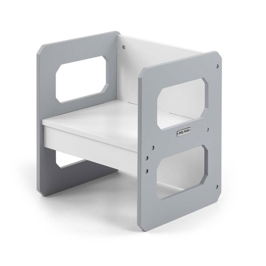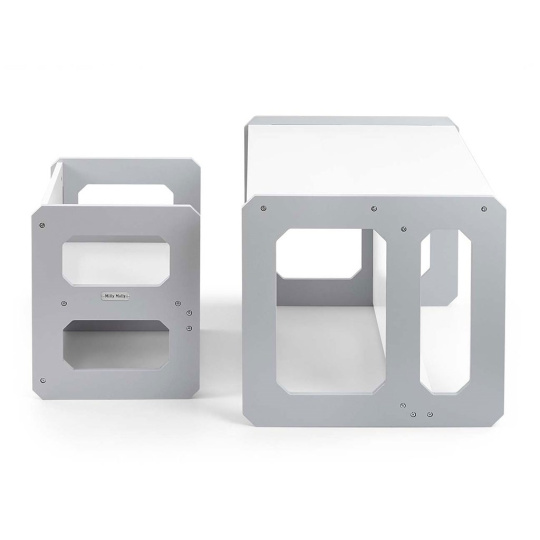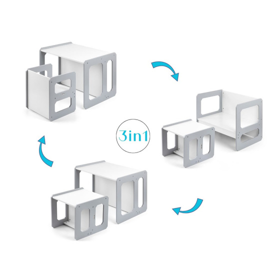 Sada se skládá z jednoho stolku a jedné židličky, které díky modulární konstrukci mohou plnit různé funkce – stolek lze proměnit ve větší sedadlo a židlička se dokonale hodí jako menší stolek nebo sedátko bez opěradla pro starší dítě. Díky své lehké konstrukci je tento nábytek snadno přenosný, což umožňuje dětem přizpůsobit si ho podle svých potřeb.