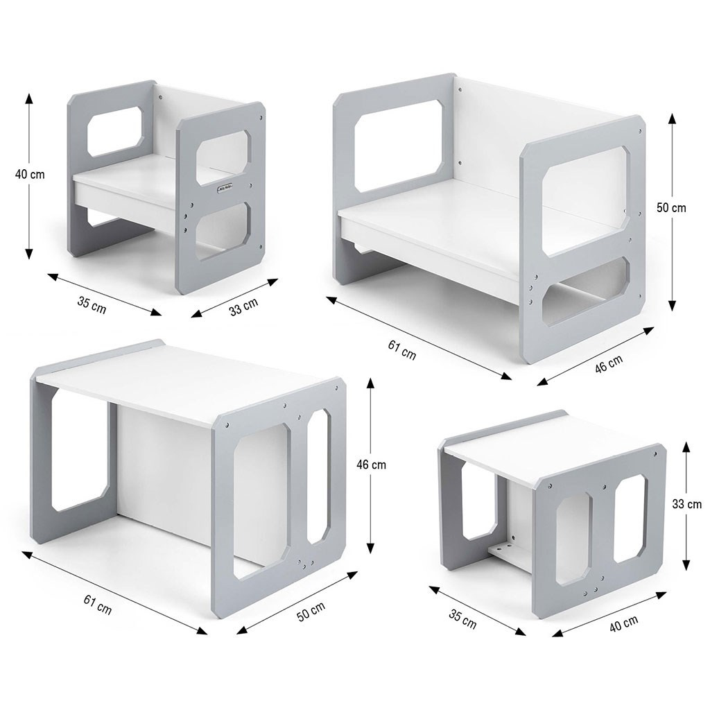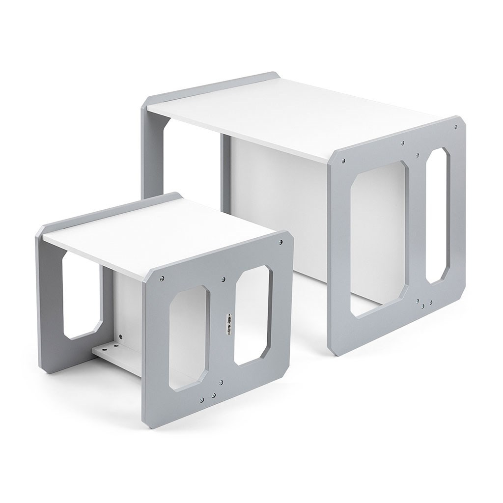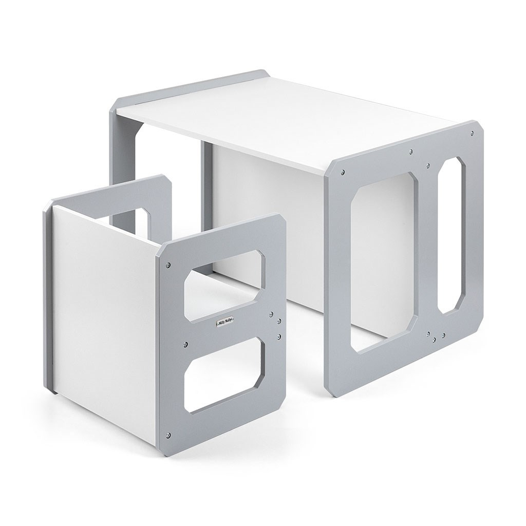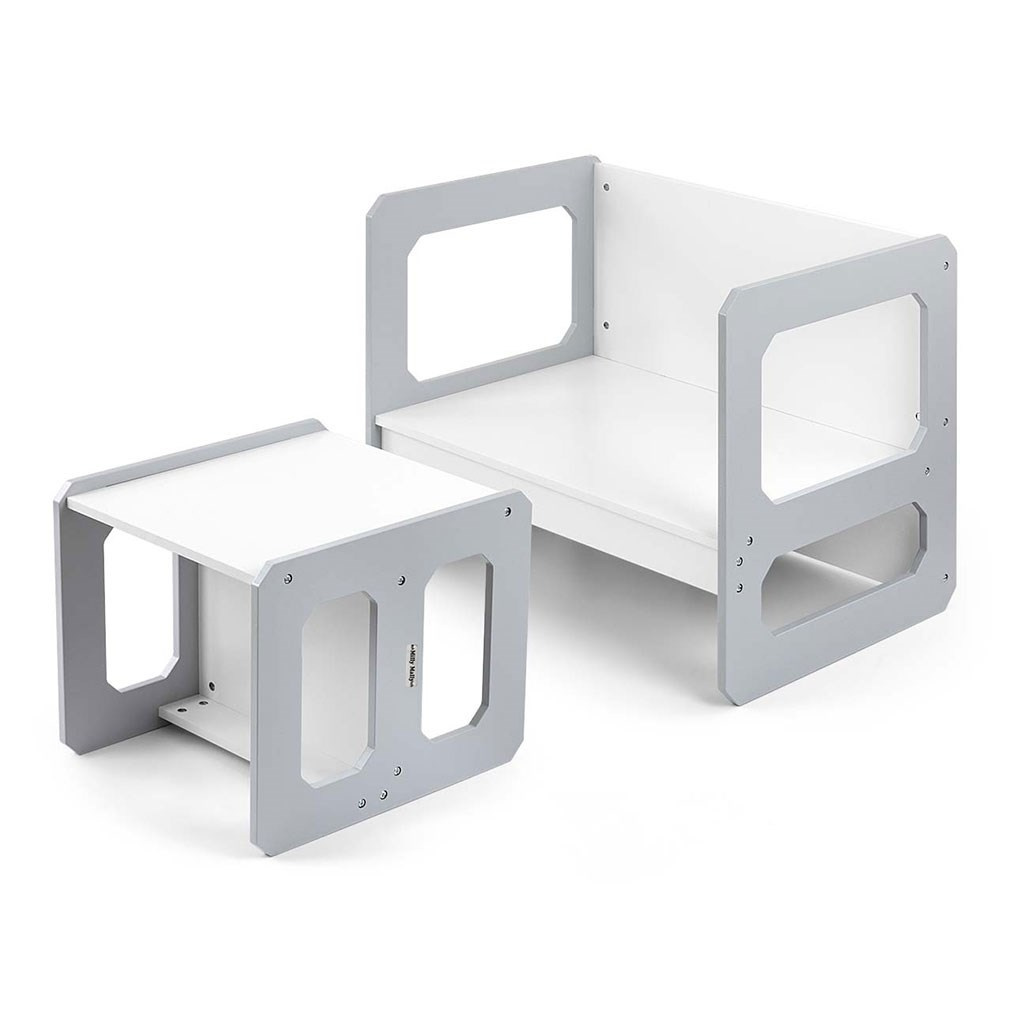 Sada se skládá z jednoho stolku a jedné židličky, které díky modulární konstrukci mohou plnit různé funkce – stolek lze proměnit ve větší sedadlo a židlička se dokonale hodí jako menší stolek nebo sedátko bez opěradla pro starší dítě. Díky své lehké konstrukci je tento nábytek snadno přenosný, což umožňuje dětem přizpůsobit si ho podle svých potřeb.