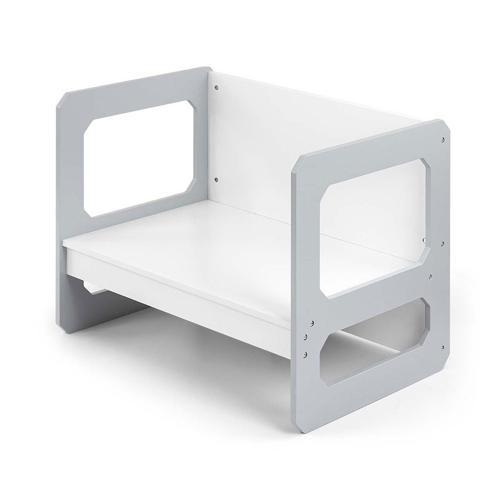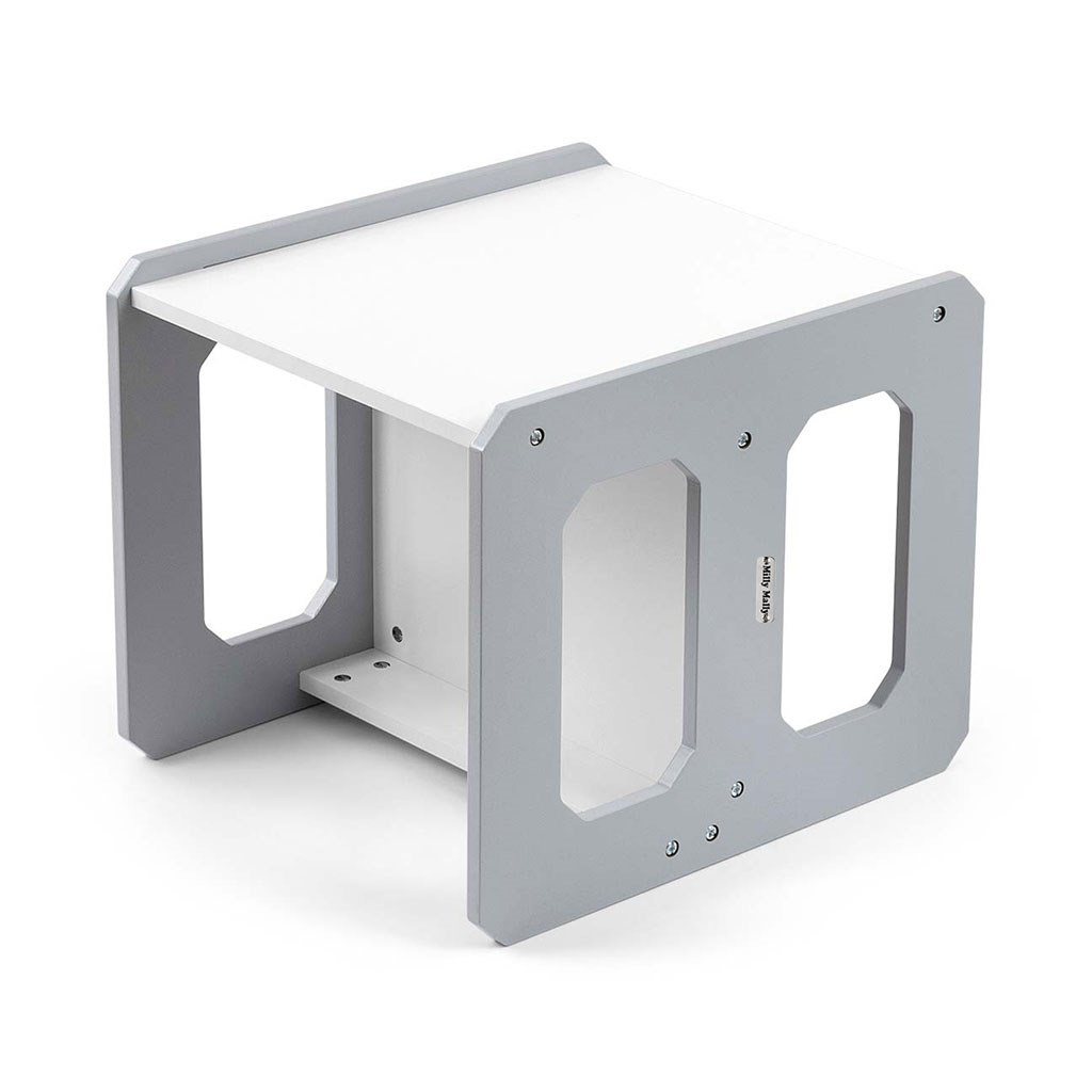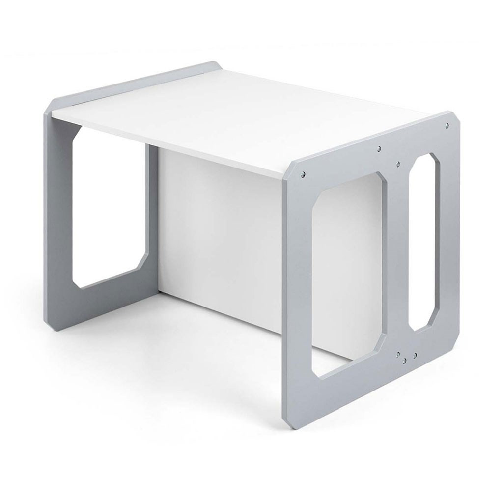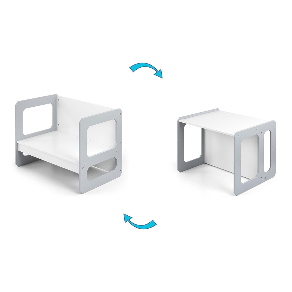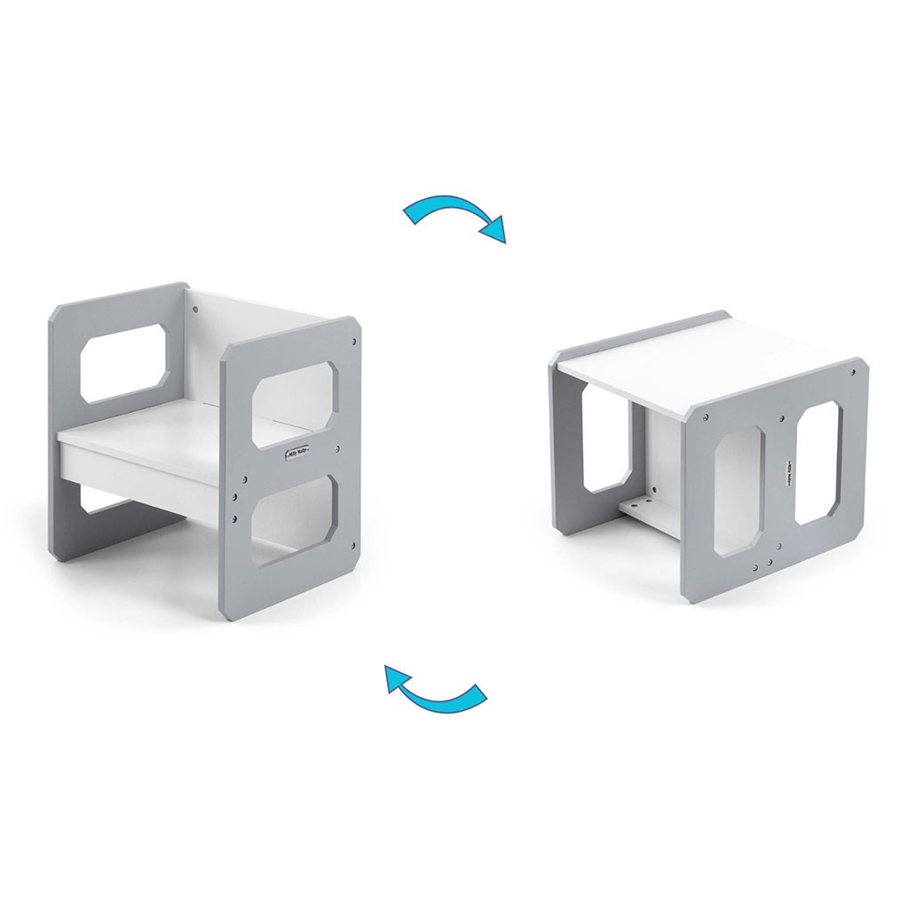 Sada se skládá z jednoho stolku a jedné židličky, které díky modulární konstrukci mohou plnit různé funkce – stolek lze proměnit ve větší sedadlo a židlička se dokonale hodí jako menší stolek nebo sedátko bez opěradla pro starší dítě. Díky své lehké konstrukci je tento nábytek snadno přenosný, což umožňuje dětem přizpůsobit si ho podle svých potřeb.