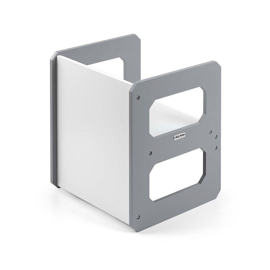 Sada nábytku 3v1 Stella v barevné kombinaci bílé a šedé se šedými doplňky, navržená s ohledem na zajištění dětem: pohodlí, prostoru pro kreativní hraní, malování, psaní a maximálního komfortu během činností.
