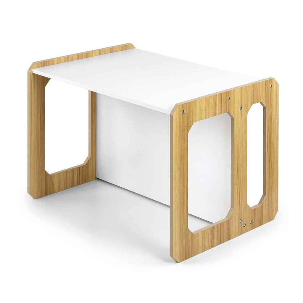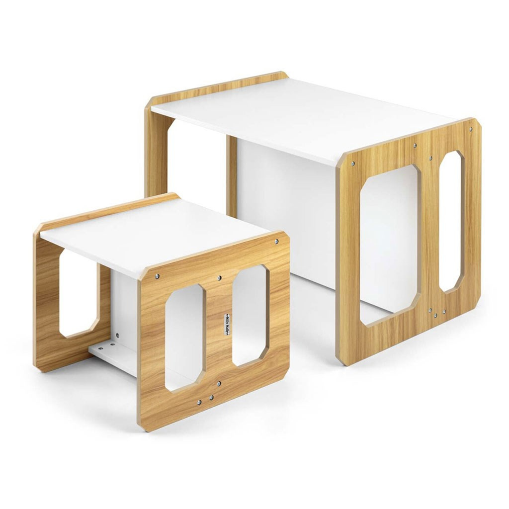 Sada se skládá z jednoho stolku a jedné židličky, které díky modulární konstrukci mohou plnit různé funkce – stolek lze proměnit ve větší sedadlo a židlička se dokonale hodí jako menší stolek nebo sedátko bez opěradla pro starší dítě. Díky své lehké konstrukci je tento nábytek snadno přenosný, což umožňuje dětem přizpůsobit si ho podle svých potřeb.