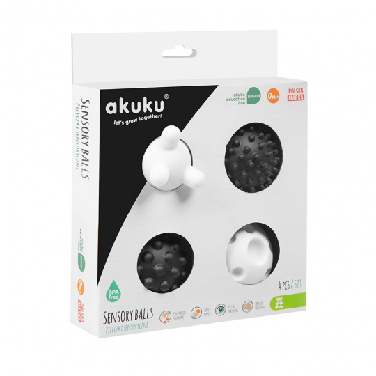 K tomu jsou ideální senzorické hračky. Jejich jedinečný tvar a struktura umožňují masáž a uvolnění svalového napětí. Doporučeno fyzioterapeuty. Poskytují mnoho smyslových vjemů. Kromě toho černé a bílé barvy dokonale stimulují zrak dítěte, protože v prvních měsících života dítě barvy nerozlišuje. Míčky mají otvory, díky kterým bude hra ve vodě ještě zábavnější.