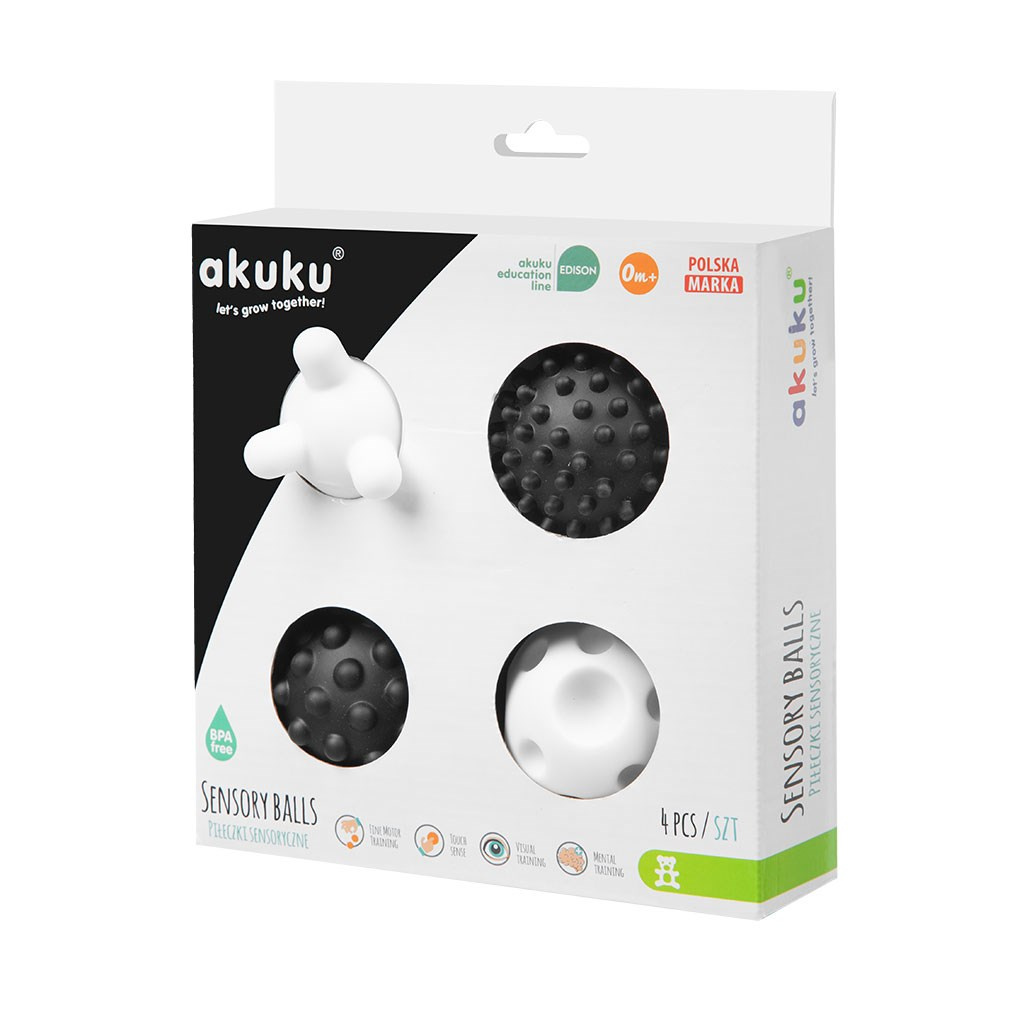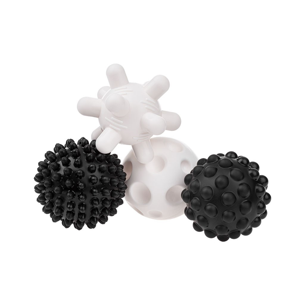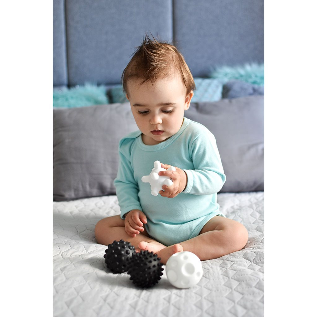 K tomu jsou ideální senzorické hračky. Jejich jedinečný tvar a struktura umožňují masáž a uvolnění svalového napětí. Doporučeno fyzioterapeuty. Poskytují mnoho smyslových vjemů. Kromě toho černé a bílé barvy dokonale stimulují zrak dítěte, protože v prvních měsících života dítě barvy nerozlišuje. Míčky mají otvory, díky kterým bude hra ve vodě ještě zábavnější.