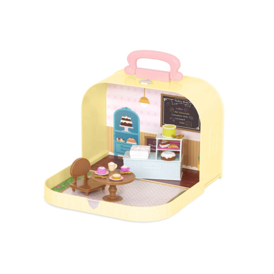 Cestovní sada hraček Li'l Woodzeeze v praktickém kufříku umožní vašemu dítěti hrát si se kdekoli na dovolené, výletech či během víkendu u prarodičů. Kufřík se po otevření promění v bohatě vybavenou cukrárnu s nábytkem a doplňky. Samostatně prodávané postavičky zvířátek Li'l Woodzeez jsou vyrobené z měkkého příjemného materiálu a mají pohyblivé ruce, nohy i hlavy pro zábavnou předstíranou hru. Každá postavička má na sobě krásné barevné oblečení. Další domečky, obchody, dopravní prostředky apod. se prodávají samostatně. Všechny postavičky a doplňky Li'l Woodzeez jsou navzájem kompatabilní a umožní vám vytvořit originální městečko pro nekonečnou hru rozvíjející fantazii a kreativitu vašeho dítěte. 20-dílná sada obsahuje kufřík, pult, stůl, židli, krabičku, horkou čokoládu, vysoký dort, dort, 1 skořicovou rolku, croissant, čokoládový dort, tác, 2 talíře, vidličku, lžíci, kleště, cappuccino, podšálek, malý jahodový dort. Rozměry: 23 x 9,2 x 17,5 cm Vhodné pro děti od 3 let.