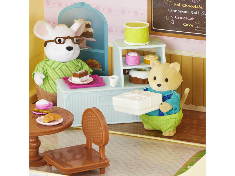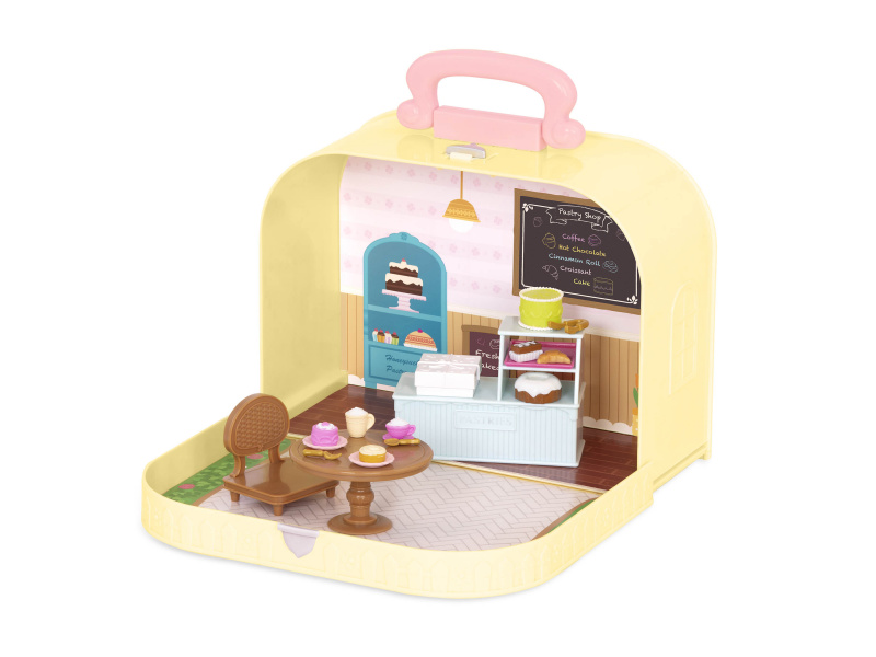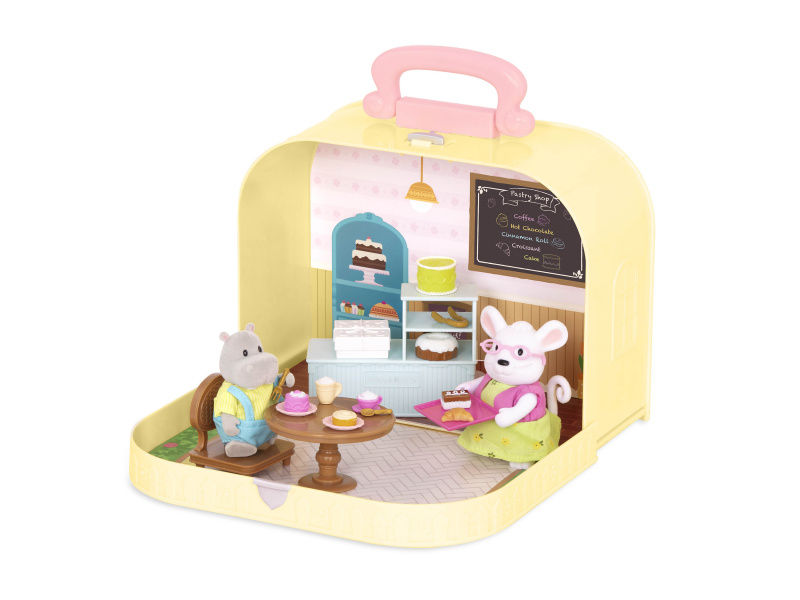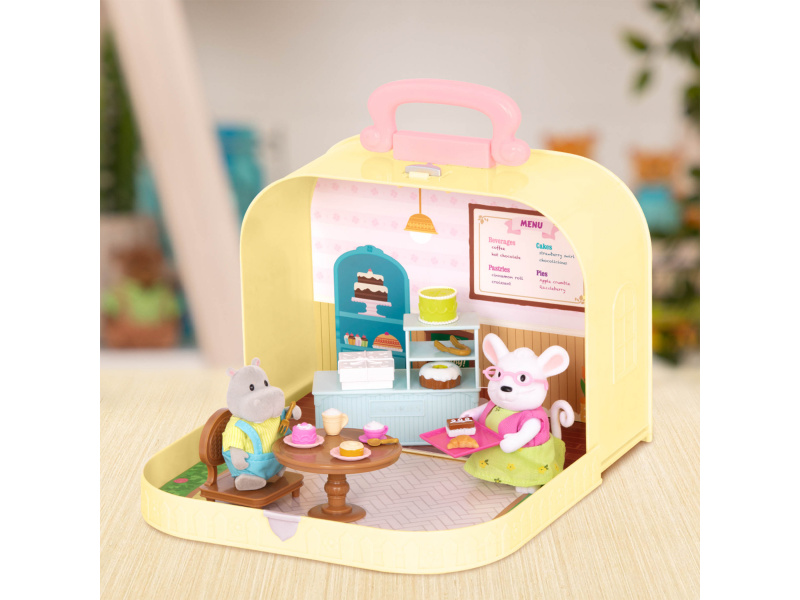 Cestovní sada hraček Li'l Woodzeeze v praktickém kufříku umožní vašemu dítěti hrát si se kdekoli na dovolené, výletech či během víkendu u prarodičů. Kufřík se po otevření promění v bohatě vybavenou cukrárnu s nábytkem a doplňky. Samostatně prodávané postavičky zvířátek Li'l Woodzeez jsou vyrobené z měkkého příjemného materiálu a mají pohyblivé ruce, nohy i hlavy pro zábavnou předstíranou hru. Každá postavička má na sobě krásné barevné oblečení. Další domečky, obchody, dopravní prostředky apod. se prodávají samostatně. Všechny postavičky a doplňky Li'l Woodzeez jsou navzájem kompatabilní a umožní vám vytvořit originální městečko pro nekonečnou hru rozvíjející fantazii a kreativitu vašeho dítěte. 20-dílná sada obsahuje kufřík, pult, stůl, židli, krabičku, horkou čokoládu, vysoký dort, dort, 1 skořicovou rolku, croissant, čokoládový dort, tác, 2 talíře, vidličku, lžíci, kleště, cappuccino, podšálek, malý jahodový dort. Rozměry: 23 x 9,2 x 17,5 cm Vhodné pro děti od 3 let.
