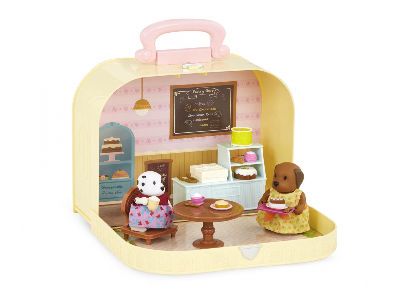 Cestovní sada hraček Li'l Woodzeeze v praktickém kufříku umožní vašemu dítěti hrát si se svými oblíbenými postavičkami kdekoli na dovolené, výletech či během víkendu u prarodičů. Kufřík se po otevření promění v bohatě vybavenou cukrárnu s nábytkem, doplňky a postavičkami pejsků Wandy a Ruby. Postavičky zvířátek Li'l Woodzeez jsou vyrobené z měkkého příjemného materiálu a mají pohyblivé ruce, nohy i hlavy pro zábavnou předstíranou hru. Každá postavička má na sobě krásné barevné oblečení. Další postavičky zvířátek, domečky, obchody, dopravní prostředky apod. se prodávají samostatně. Všechny postavičky a doplňky Li'l Woodzeez jsou navzájem kompatabilní a umožní vám vytvořit originální městečko pro nekonečnou hru rozvíjející fantazii a kreativitu vašeho dítěte. 22-dílná sada obsahuje kufřík, 2 postavičky pejsků, pult, stůl, židli, krabičku, horkou čokoládu, vysoký dort, dort, 1 skořicovou rolku, croissant, čokoládový dort, tác, 2 talíře, vidličku, lžíci, kleště, cappuccino, podšálek, malý jahodový dort. Vhodné pro děti od 3 let.