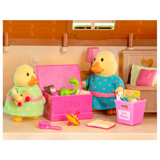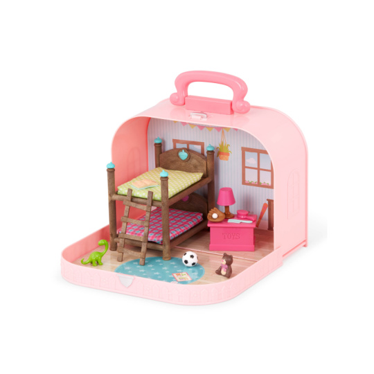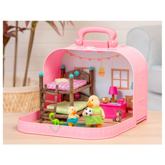 Cestovní sada hraček Li'l Woodzeeze v praktickém kufříku umožní vašemu dítěti hrát si kdekoli na dovolené, výletech či během víkendu u prarodičů. Kufřík se po otevření promění v bohatě vybavený dětský pokoj s nábytkem a doplňky. Samostatně prodávané postavičky zvířátek Li'l Woodzeez jsou vyrobené z měkkého příjemného materiálu a mají pohyblivé ruce, nohy i hlavy pro zábavnou předstíranou hru. Každá postavička má na sobě krásné barevné oblečení. Další domečky, obchody, dopravní prostředky apod. se prodávají samostatně. Všechny postavičky a doplňky Li'l Woodzeez jsou navzájem kompatabilní a umožní vám vytvořit originální městečko pro nekonečnou hru rozvíjející fantazii a kreativitu vašeho dítěte. 14-dílná sada obsahuje kufřík, palandu, 2 matrace, žebřík, box na hračky, fotbalový míč, medvídka, 1 míč a rukavice, knihu, lampu, dinosaura, kartáč a hřeben. Rozměry: 23 x 9,2 x 17,5 cm Vhodné pro děti od 3 let.