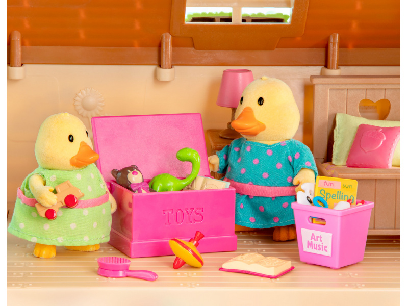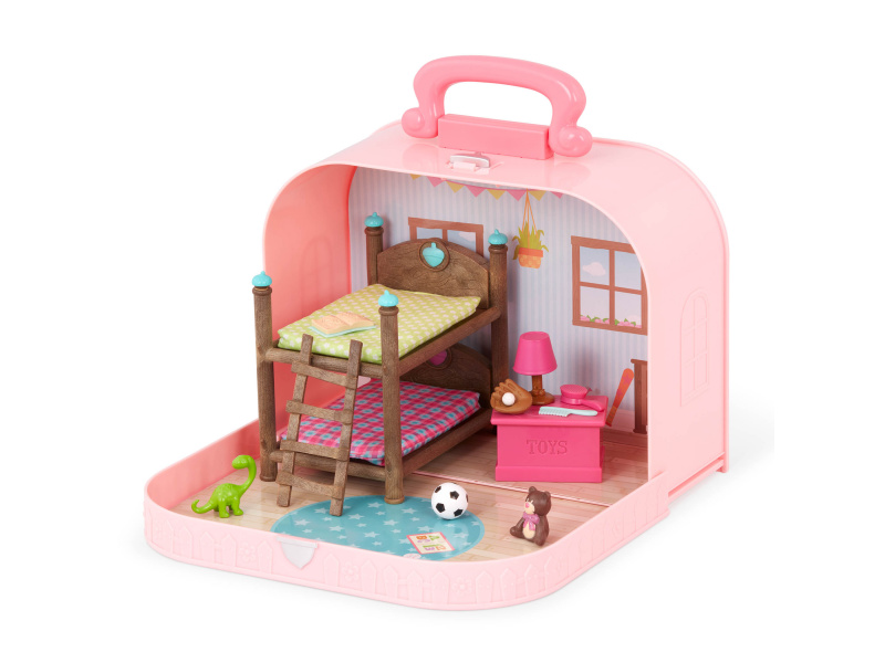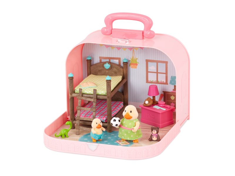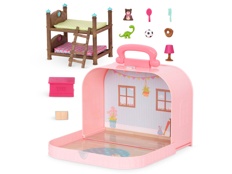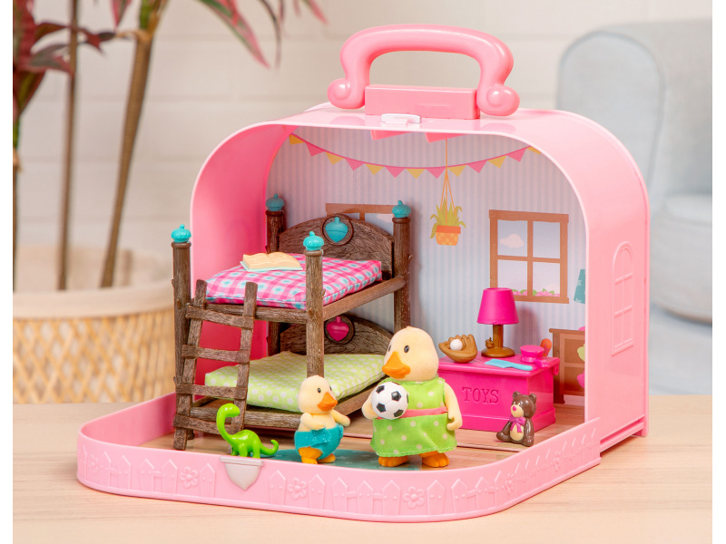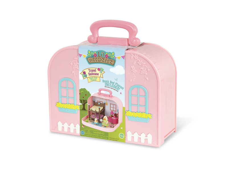Cestovní sada hraček Li'l Woodzeeze v praktickém kufříku umožní vašemu dítěti hrát si kdekoli na dovolené, výletech či během víkendu u prarodičů. Kufřík se po otevření promění v bohatě vybavený dětský pokoj s nábytkem a doplňky. Samostatně prodávané postavičky zvířátek Li'l Woodzeez jsou vyrobené z měkkého příjemného materiálu a mají pohyblivé ruce, nohy i hlavy pro zábavnou předstíranou hru. Každá postavička má na sobě krásné barevné oblečení. Další domečky, obchody, dopravní prostředky apod. se prodávají samostatně. Všechny postavičky a doplňky Li'l Woodzeez jsou navzájem kompatabilní a umožní vám vytvořit originální městečko pro nekonečnou hru rozvíjející fantazii a kreativitu vašeho dítěte. 14-dílná sada obsahuje kufřík, palandu, 2 matrace, žebřík, box na hračky, fotbalový míč, medvídka, 1 míč a rukavice, knihu, lampu, dinosaura, kartáč a hřeben. Rozměry: 23 x 9,2 x 17,5 cm Vhodné pro děti od 3 let.