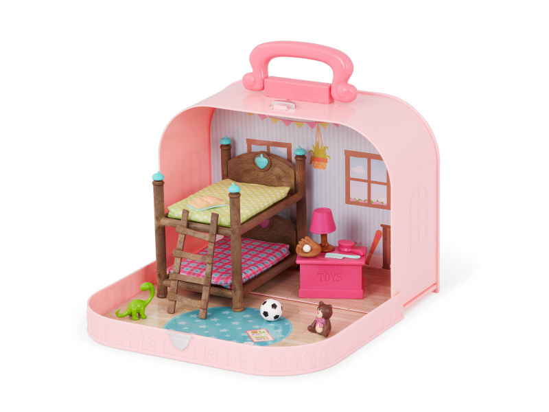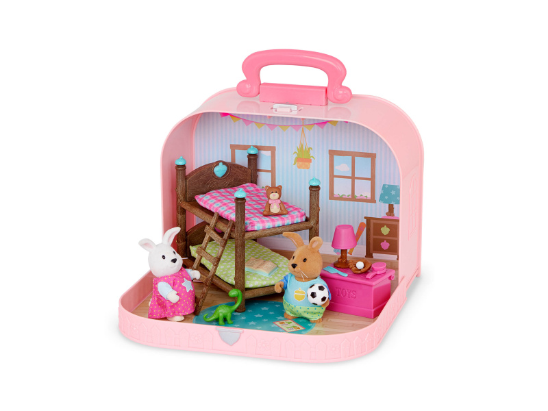 Cestovní sada hraček Li'l Woodzeeze v praktickém kufříku umožní vašemu dítěti hrát si se svými oblíbenými postavičkami kdekoli na dovolené, výletech či během víkendu u prarodičů. Kufřík se po otevření promění v bohatě vybavený dětský pokoj s nábytkem, doplňky a postavičkami králíčků Chucka a Amelie. Postavičky zvířátek Li'l Woodzeez jsou vyrobené z měkkého příjemného materiálu a mají pohyblivé ruce, nohy i hlavy pro zábavnou předstíranou hru. Každá postavička má na sobě krásné barevné oblečení. Další postavičky zvířátek, domečky, obchody, dopravní prostředky apod. se prodávají samostatně. Všechny postavičky a doplňky Li'l Woodzeez jsou navzájem kompatabilní a umožní vám vytvořit originální městečko pro nekonečnou hru rozvíjející fantazii a kreativitu vašeho dítěte. 16-dílná sada obsahuje kufřík, 2 postavičky zvířátek, palandu, 2 matrace, žebřík, box na hračky, fotbalový míč, medvídka, 1 míč a rukavice, knihu, lampu, dinosaura, kartáč a hřeben. Vhodné pro děti od 3 let.