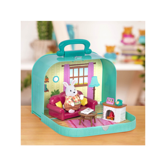Cestovní sada hraček Li'l Woodzeeze v praktickém kufříku umožní vašemu dítěti hrát si kdekoli na dovolené, výletech či během víkendu u prarodičů. Kufřík se po otevření promění v bohatě vybavený obývací pokoj s nábytkem a doplňky. Samostatně prodávané postavičky zvířátek Li'l Woodzeez jsou vyrobené z měkkého příjemného materiálu a mají pohyblivé ruce, nohy i hlavy pro zábavnou předstíranou hru. Každá postavička má na sobě krásné barevné oblečení. Další domečky, obchody, dopravní prostředky apod. se prodávají samostatně. Všechny postavičky a doplňky Li'l Woodzeez jsou navzájem kompatabilní a umožní vám vytvořit originální městečko pro nekonečnou hru rozvíjející fantazii a kreativitu vašeho dítěte. 13-dílná sada obsahuje kufřík, pohovku, 2 polštáře, rámeček, 2 fotografie, noviny, krb, oheň, konferenční stolek, telefon a hrnek. Rozměry: 23 x 9,2 x 17,5 cm Vhodné pro děti od 3 let.