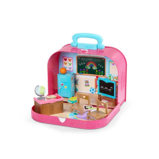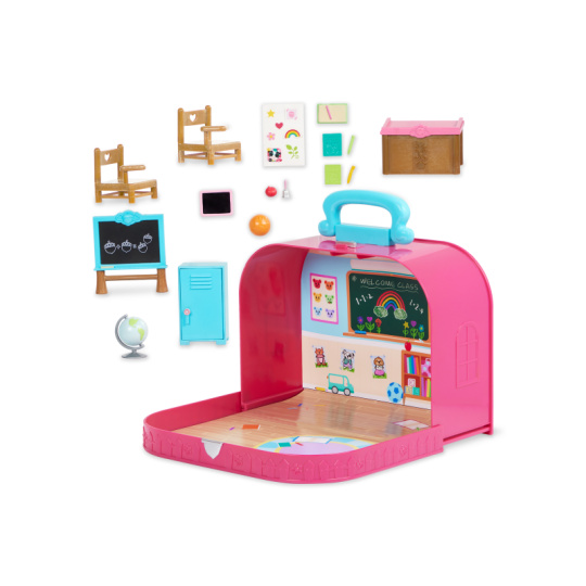 Cestovní sada hraček Li'l Woodzeeze v praktickém kufříku umožní vašemu dítěti hrát si se kdekoli na dovolené, výletech či během víkendu u prarodičů. Kufřík se po otevření promění v bohatě vybavenou školní třídu s nábytkem a doplňky. Samostatně prodávané postavičky zvířátek Li'l Woodzeez jsou vyrobené z měkkého příjemného materiálu a mají pohyblivé ruce, nohy i hlavy pro zábavnou předstíranou hru. Každá postavička má na sobě krásné barevné oblečení. Další domečky, obchody, dopravní prostředky apod. se prodávají samostatně. Všechny postavičky a doplňky Li'l Woodzeez jsou navzájem kompatabilní a umožní vám vytvořit originální městečko pro nekonečnou hru rozvíjející fantazii a kreativitu vašeho dítěte. 17-dílná sada obsahuje kufřík, tabuli, skříňku, dvě židle, stůl, globus, míč, knihy, sešit, psací potřeby, zvonek, jablko, tabulku a samolepky. Rozměry: 23 x 9,2 x 17,5 cm Vhodné pro děti od 3 let.