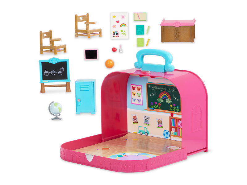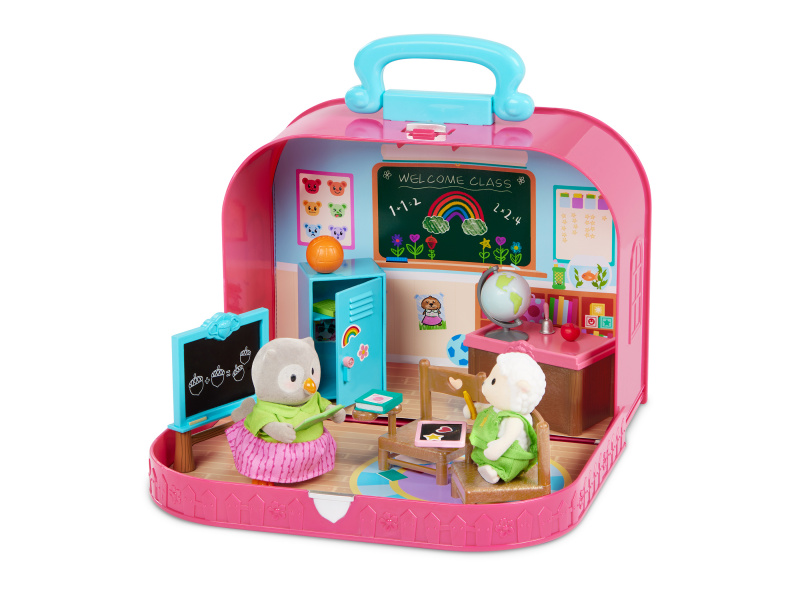 Cestovní sada hraček Li'l Woodzeeze v praktickém kufříku umožní vašemu dítěti hrát si se kdekoli na dovolené, výletech či během víkendu u prarodičů. Kufřík se po otevření promění v bohatě vybavenou školní třídu s nábytkem a doplňky. Samostatně prodávané postavičky zvířátek Li'l Woodzeez jsou vyrobené z měkkého příjemného materiálu a mají pohyblivé ruce, nohy i hlavy pro zábavnou předstíranou hru. Každá postavička má na sobě krásné barevné oblečení. Další domečky, obchody, dopravní prostředky apod. se prodávají samostatně. Všechny postavičky a doplňky Li'l Woodzeez jsou navzájem kompatabilní a umožní vám vytvořit originální městečko pro nekonečnou hru rozvíjející fantazii a kreativitu vašeho dítěte. 17-dílná sada obsahuje kufřík, tabuli, skříňku, dvě židle, stůl, globus, míč, knihy, sešit, psací potřeby, zvonek, jablko, tabulku a samolepky. Rozměry: 23 x 9,2 x 17,5 cm Vhodné pro děti od 3 let.