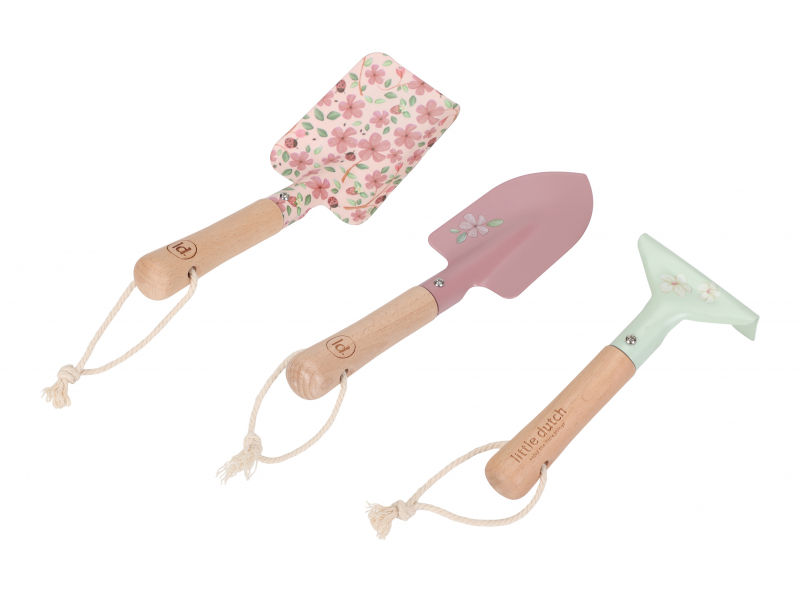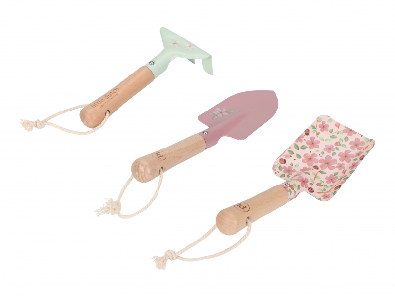 Malá zahradnice či zahradník potřebuje pro své zahradničení své vlastní nářadí! Tato sada obsahuje dvě lopatky a hrabičky v kvalitním provedení z odolného kovu s dřevěnou rukojetí pro pohodlné uchopení. Nářadí je zdobené krásným potiskem, praktická poutka umožňují po skončení práce zavěšení nářadí kdekoli, kde bude připravené pro další použití. Nářadí s krásným potiskem je součástí designové kolekce hraček a doplňků Little Dutch Fairy Garden, inspirované životem na zahradě. Vhodné pro děti od 3 let.