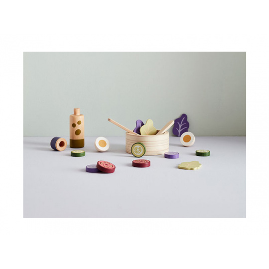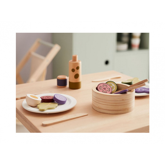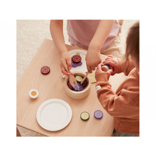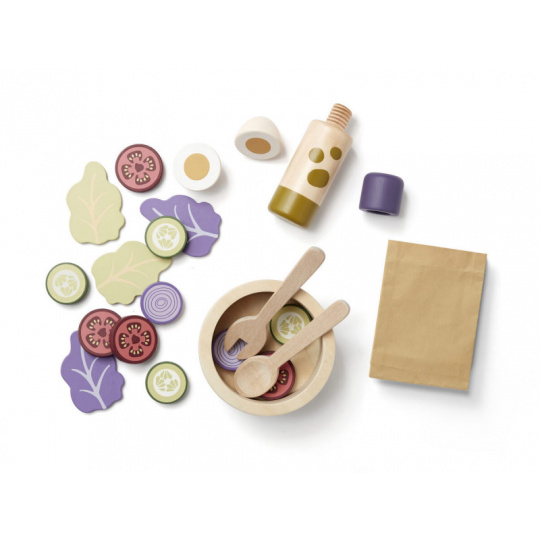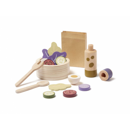 Sada pro přípravu zeleninového salátu v dřevěném provedení obsahuje salátovou mísu, dvě lžíce, láhev s olejem, rozkrojené vejce, salátové listy, kolečka okurky, rajčat a červené cibule. Součástí je i papírová taška pro uložení všech surovin. Nechte se pozvat na výborný zdravý oběd či večeři v dětské restauraci vašeho malého kuchaře či kuchařky! Rozměry salátové mísy: 11 x 11 x 5 cm Vhodné pro děti od 3 let.