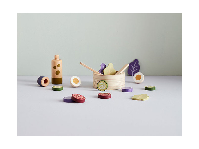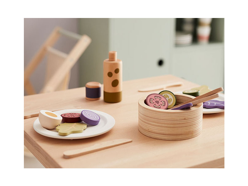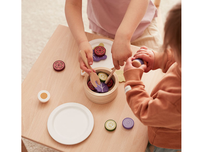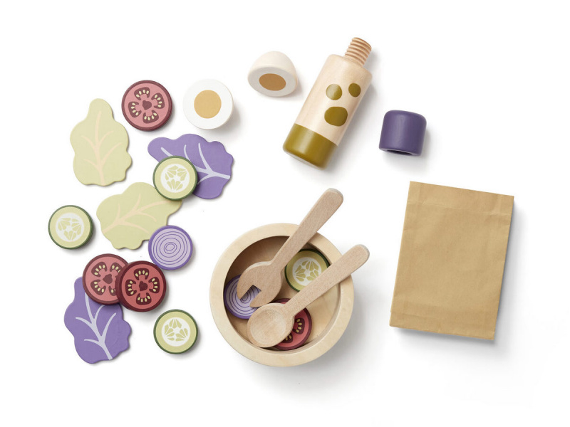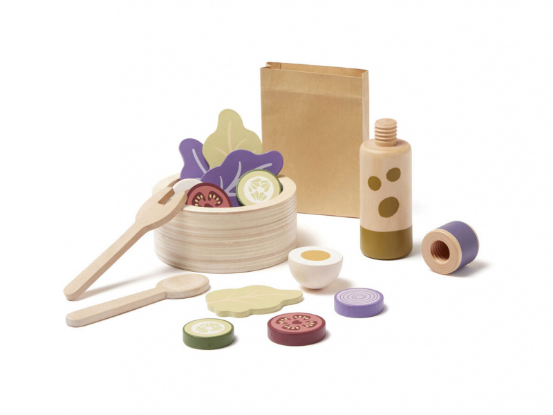 Sada pro přípravu zeleninového salátu v dřevěném provedení obsahuje salátovou mísu, dvě lžíce, láhev s olejem, rozkrojené vejce, salátové listy, kolečka okurky, rajčat a červené cibule. Součástí je i papírová taška pro uložení všech surovin. Nechte se pozvat na výborný zdravý oběd či večeři v dětské restauraci vašeho malého kuchaře či kuchařky! Rozměry salátové mísy: 11 x 11 x 5 cm Vhodné pro děti od 3 let.