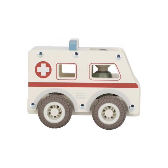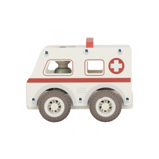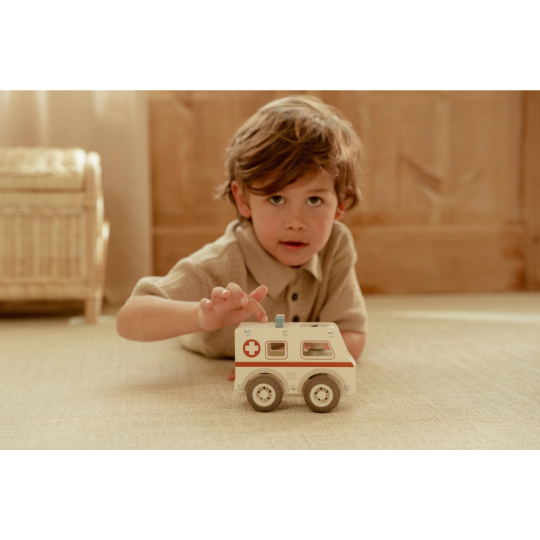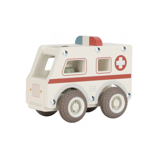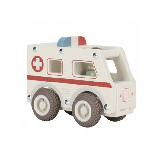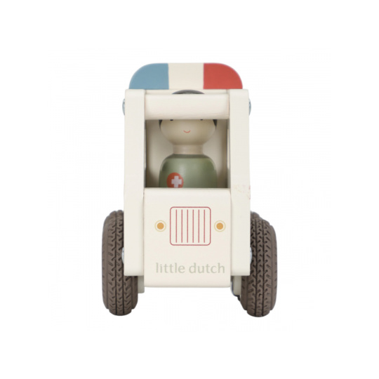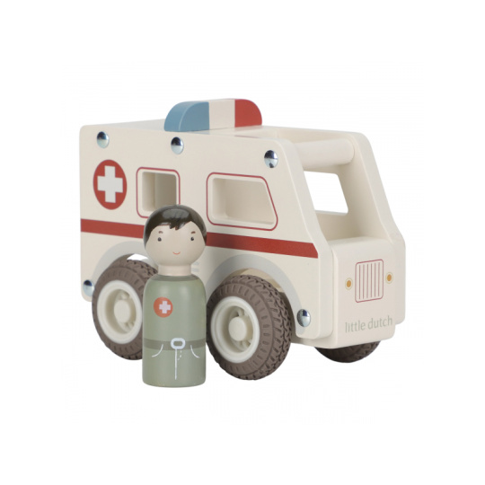 Záchranka je na cestě! Dřevěná sanitka s realistickými detaily a kolečky s gumovými pneumatikami je připravena rychle dopravit pacienta do nemocnice. Díky otevřenému designu se snadno drží a ovládá i malými dětskými ručičkami. Uvnitř je místo pro pacienty a součástí balení je také figurka záchranáře. Ideální pro hraní na doktory a záchranáře – děti si mohou vytvářet vlastní příběhy, rozvíjet empatii a trénovat jemnou motoriku. Hračka je součástí kolekce vysoce kvalitních dřevěných hraček Little Dutch, navržených s důrazem na bezpečnost a originální design. Vyrobeno z odolného FSC certifikovaného dřeva. Rozměry: 11 x 7,2 x 13,5 cm Vhodné pro děti od 18 měsíců.