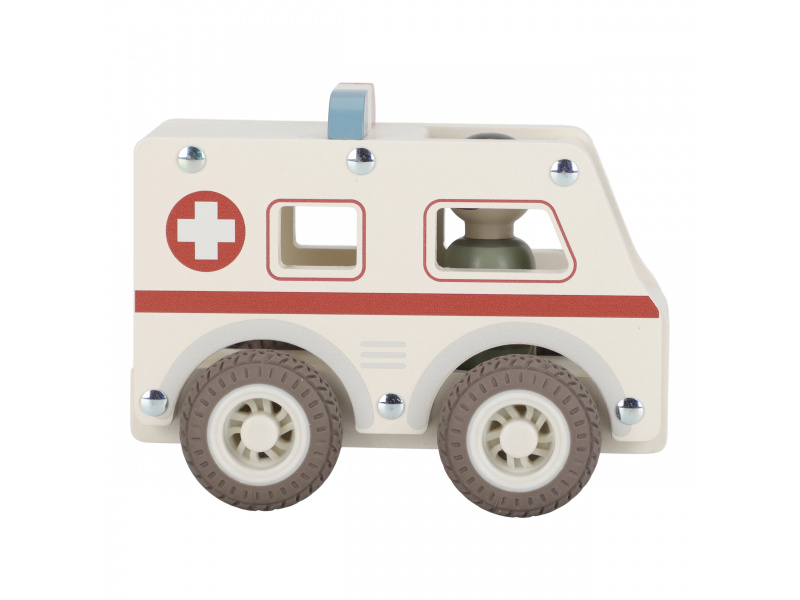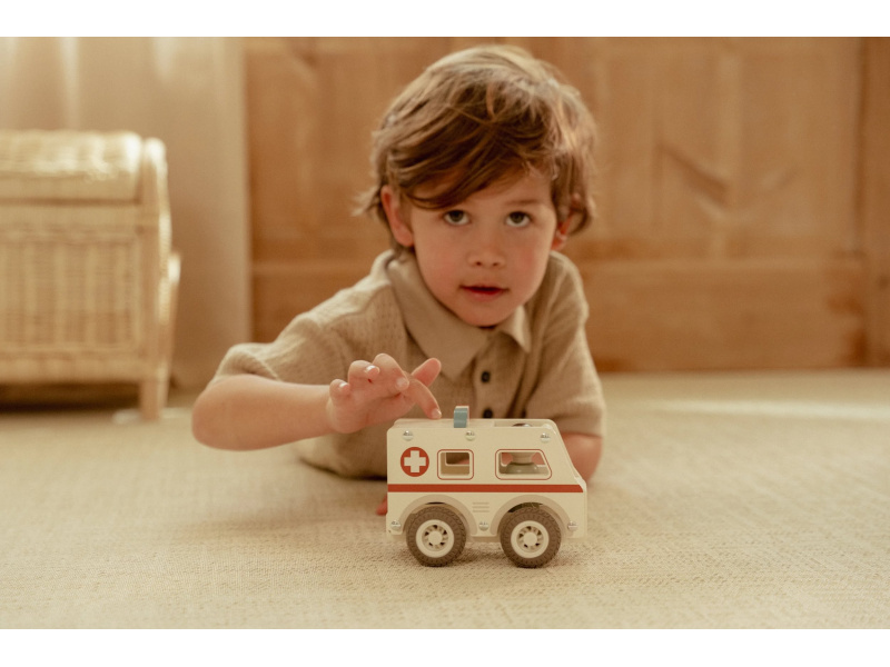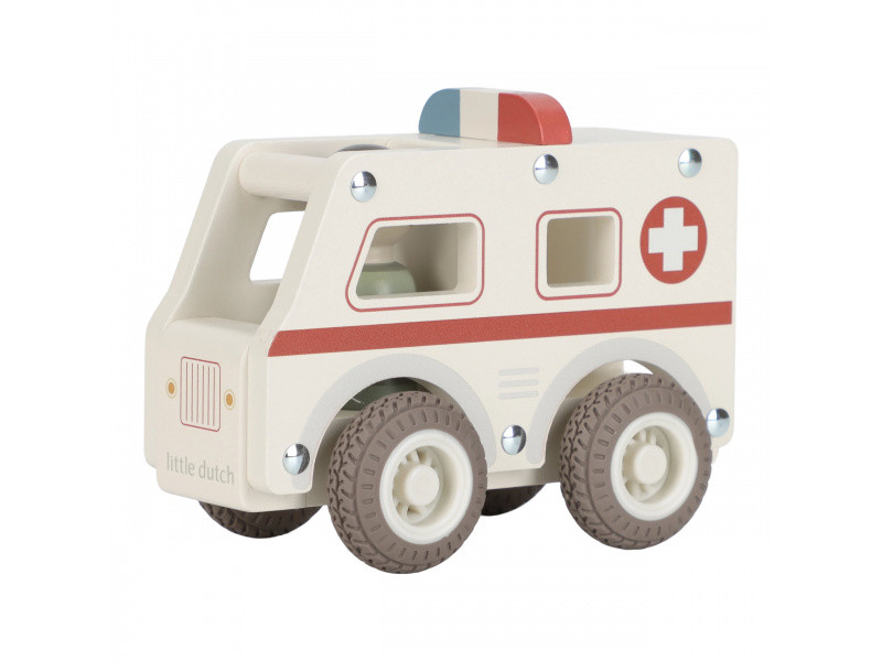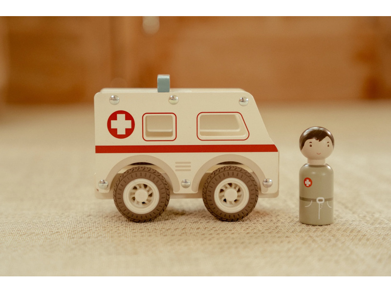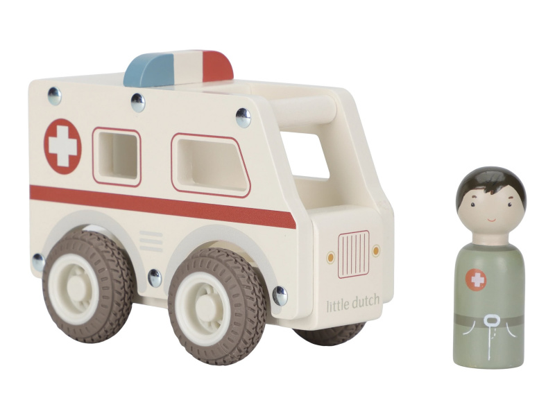 Záchranka je na cestě! Dřevěná sanitka s realistickými detaily a kolečky s gumovými pneumatikami je připravena rychle dopravit pacienta do nemocnice. Díky otevřenému designu se snadno drží a ovládá i malými dětskými ručičkami. Uvnitř je místo pro pacienty a součástí balení je také figurka záchranáře. Ideální pro hraní na doktory a záchranáře – děti si mohou vytvářet vlastní příběhy, rozvíjet empatii a trénovat jemnou motoriku. Hračka je součástí kolekce vysoce kvalitních dřevěných hraček Little Dutch, navržených s důrazem na bezpečnost a originální design. Vyrobeno z odolného FSC certifikovaného dřeva. Rozměry: 11 x 7,2 x 13,5 cm Vhodné pro děti od 18 měsíců.