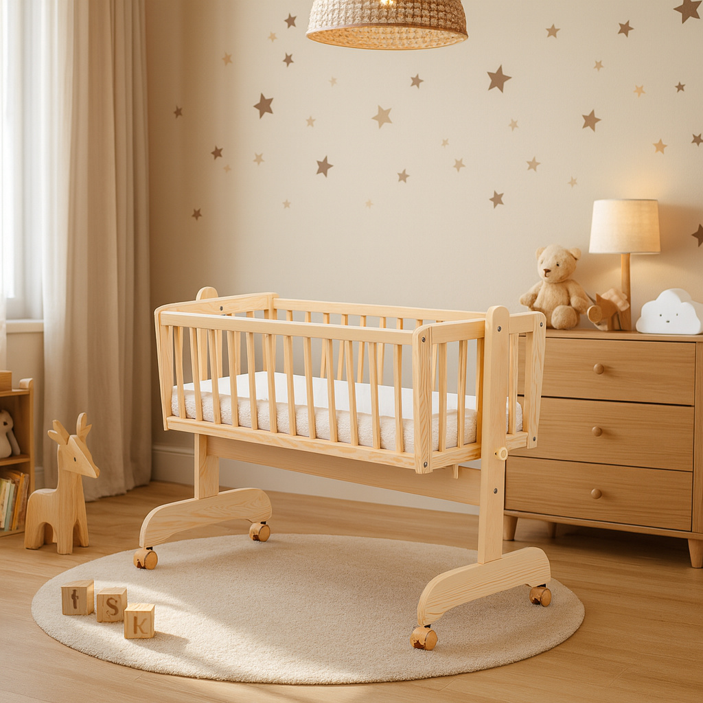 Krásná kolébka z borovicoveho dřeva je ideální pro usínání miminek.