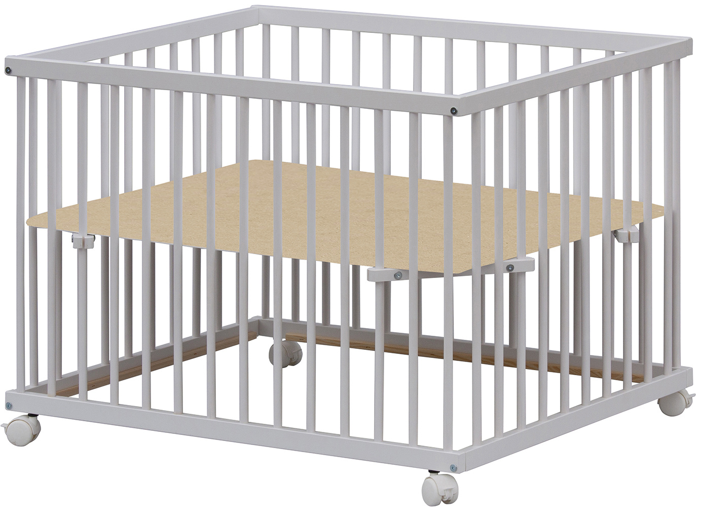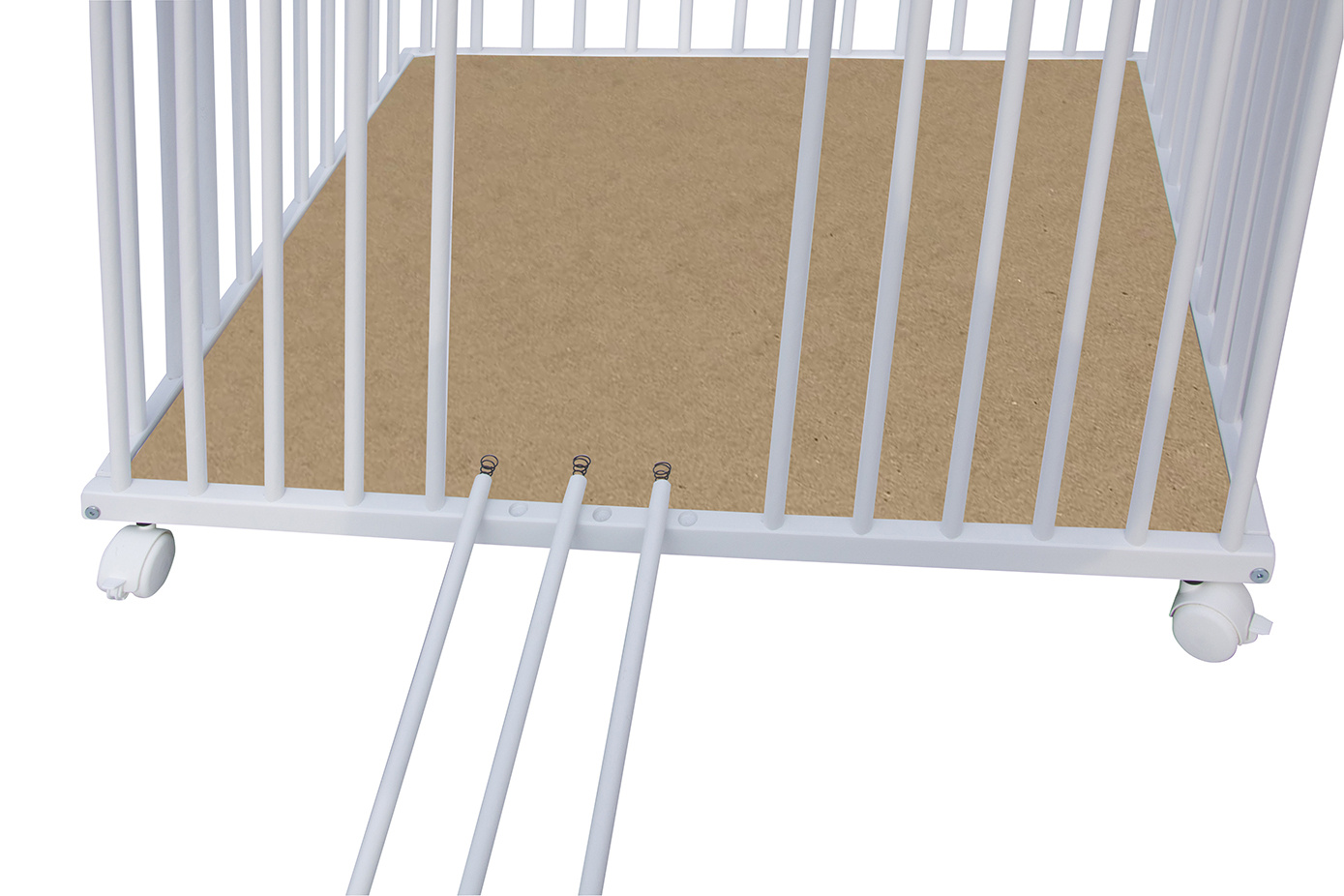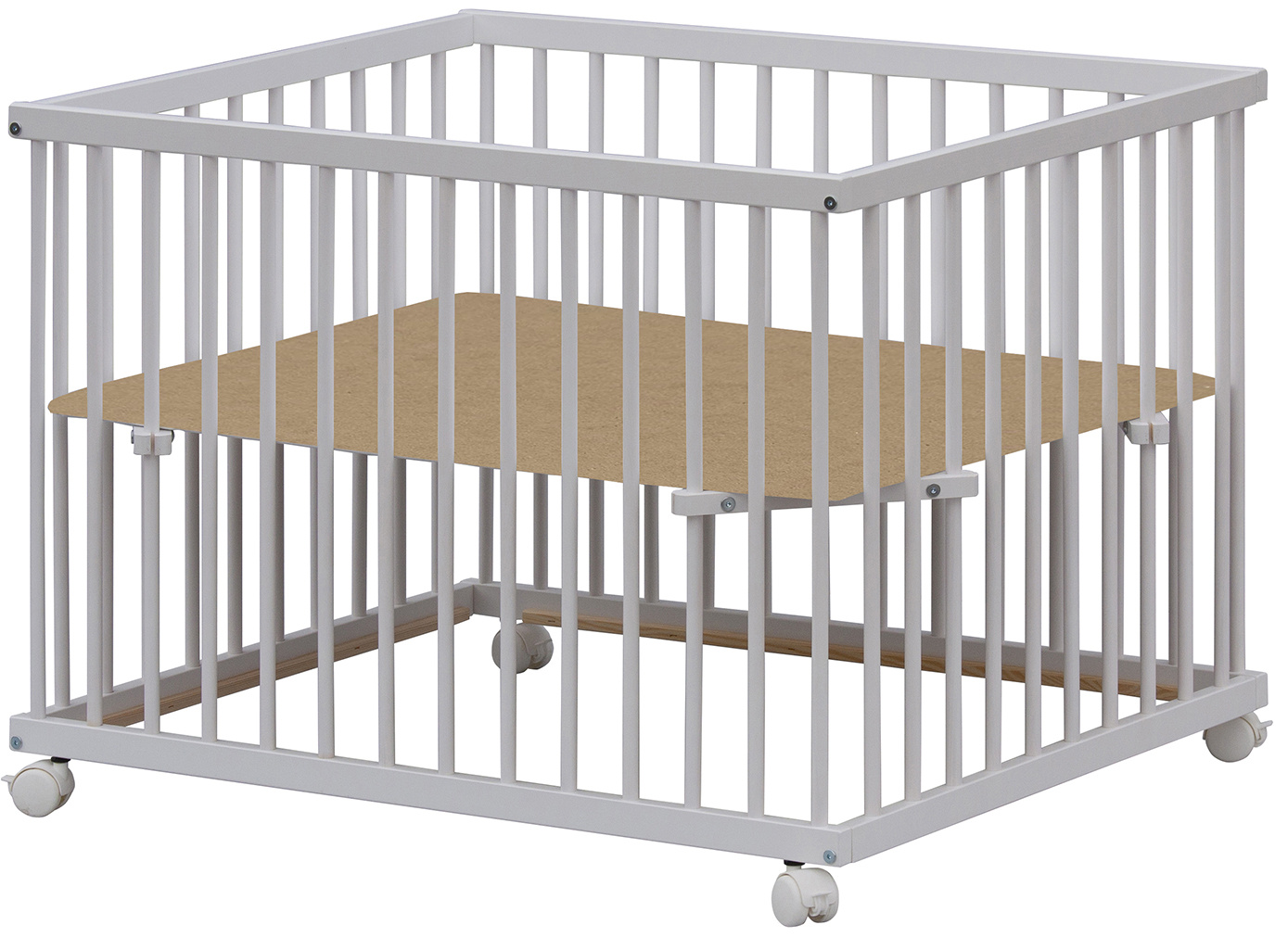Dno je vyrobeno z MDF pro snazší údržbu. Otvory na kolečka jsou předvrtány, ale kolečka nejsou součástí ohrádky, lze si je doobjednat z naší nabídky. K ohrádce si můžete vybrat z nabídky hracích dek.