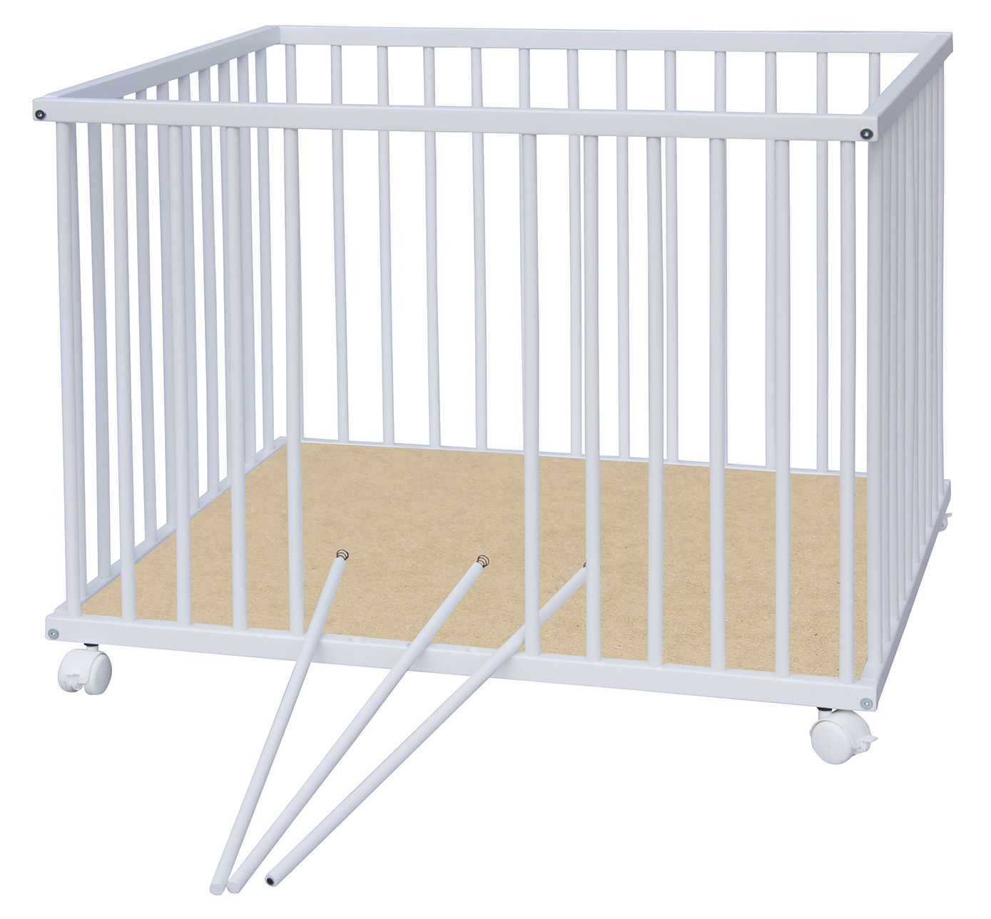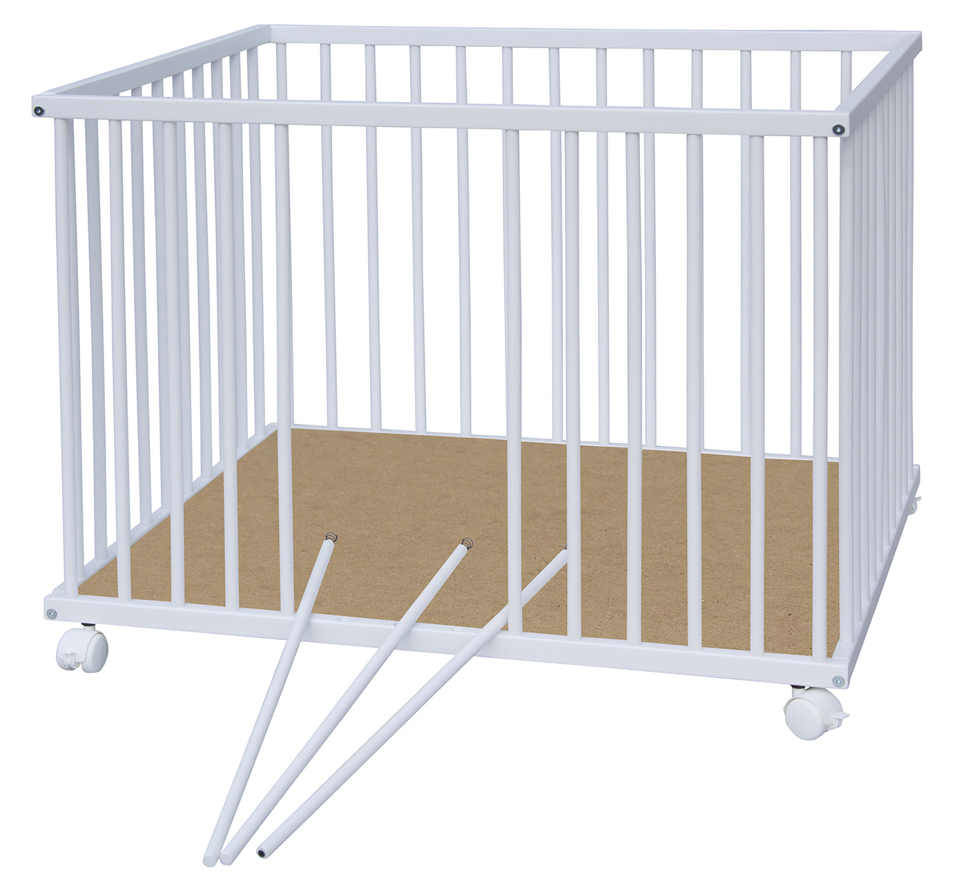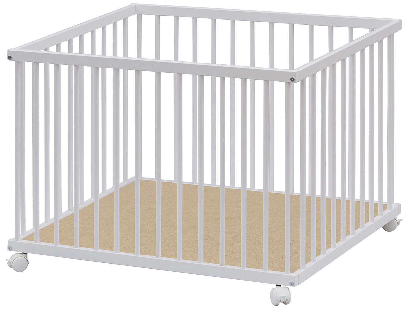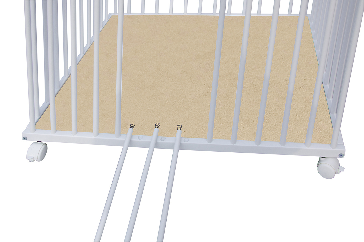 Dno je vyrobeno z MDF pro snazší údržbu. Otvory na kolečka jsou předvrtány, ale kolečka nejsou součástí ohrádky, lze si je doobjednat z naší nabídky. K ohrádce si můžete vybrat z nabídky hracích dek.