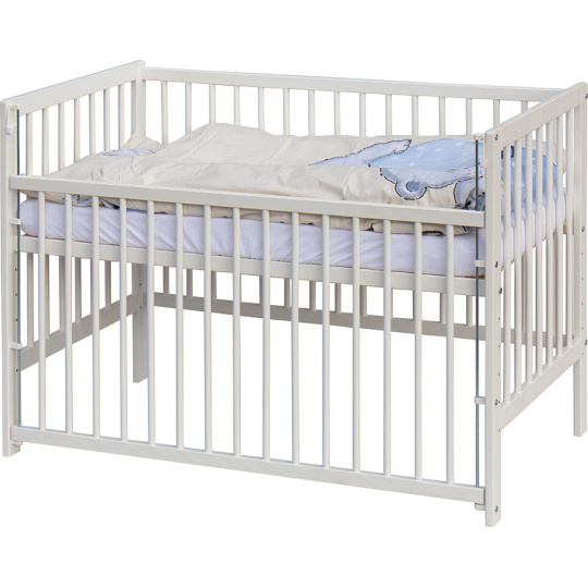 1. Dětská dřevěná postýlka 120 x 60 cm - bílá, masiv borovice, stahovací bok, 6 poloh roštu