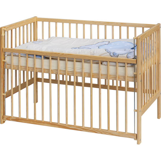 1. Dětská dřevěná postýlka 120 x 60 cm - přírodní, masiv borovice, stahovací bok, 6 poloh roštu
