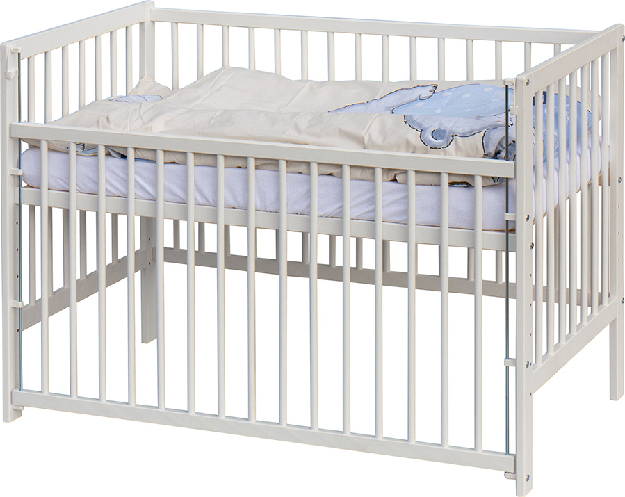 1. Dětská dřevěná postýlka 120 x 60 cm - bílá, masiv borovice, stahovací bok, 6 poloh roštu