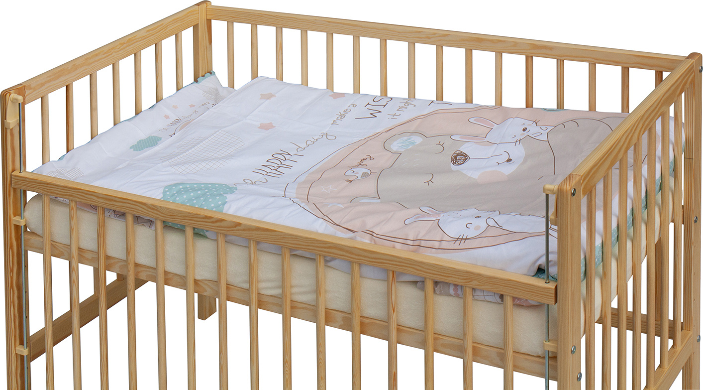 1. Dětská dřevěná postýlka 120 x 60 cm - přírodní, masiv borovice, stahovací bok, 6 poloh roštu