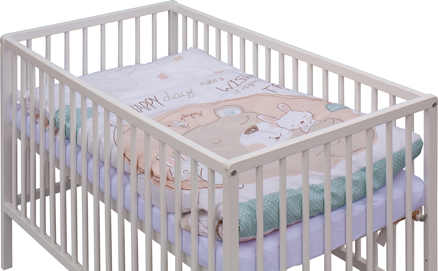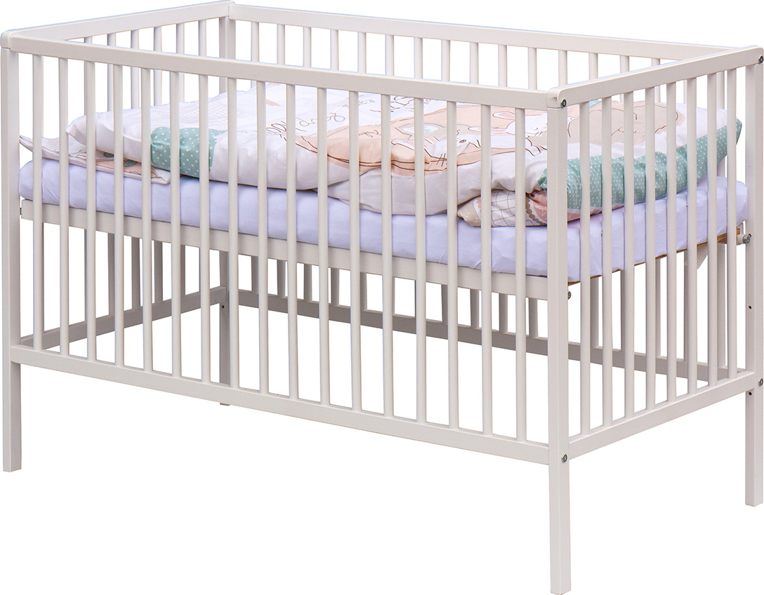 1. Dětská dřevěná postýlka 120x60 cm - bílá, masiv buk, 3 vyndavací příčky, 3 polohy roštu