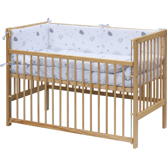 1. Dětská dřevěná postýlka 120 x 60 cm - přírodní, masiv borovice, stahovací bok, 6 poloh roštu