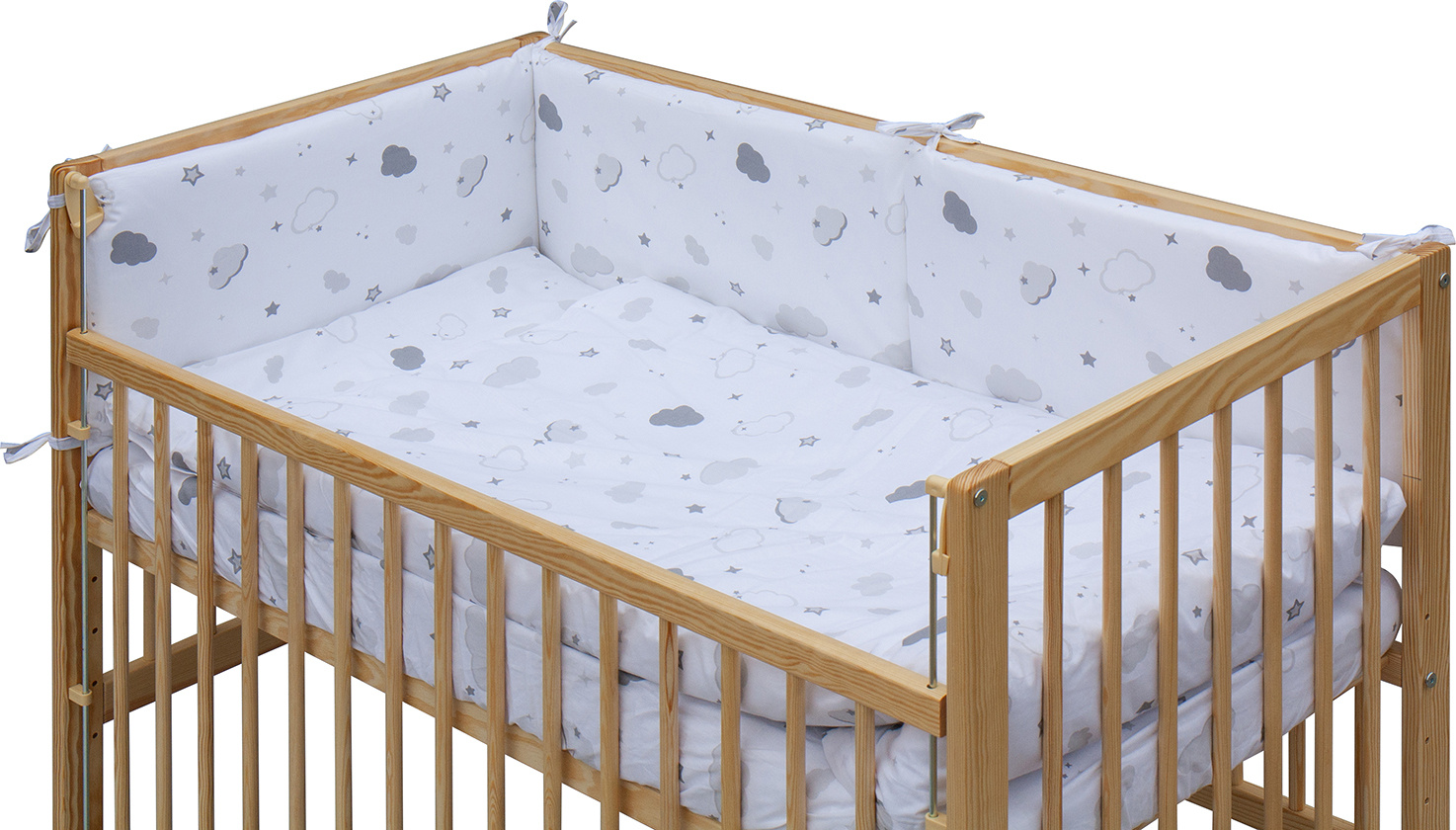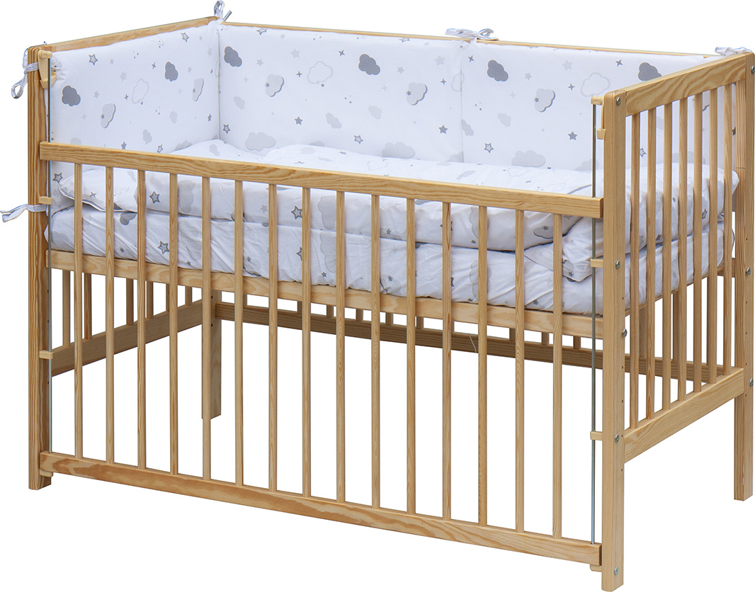 1. Dětská dřevěná postýlka 120 x 60 cm - přírodní, masiv borovice, stahovací bok, 6 poloh roštu